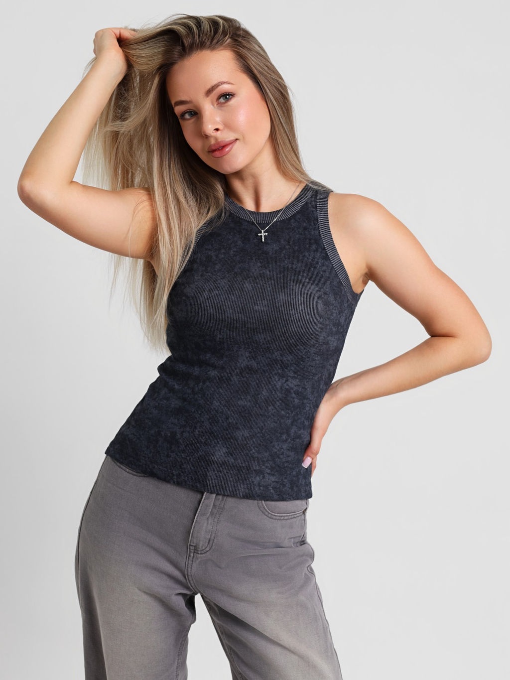 Майка молодежная из трикотажного полотна «кашкорсе» с эффектом «варенки», классического покроя, с окантованными основным материалом проймами и горловиной.