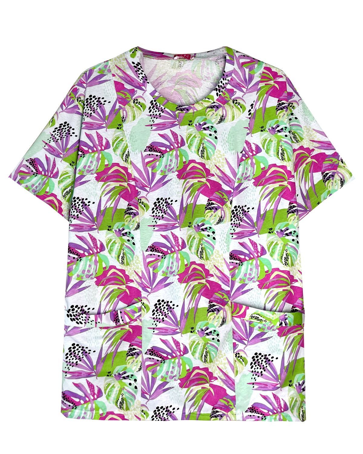Футболка свободного силуэта из набивного полотна со спущенным плечом коротким рукавом и накладными карманами. Горловина круглая, обработана обтачкой из основного полотна. На передней полочке рельефыи накладные карманы с обтачкой. Низ изделия и рукавов обработан швом вподгибку. Модель рассчитана на рост 164-170см.