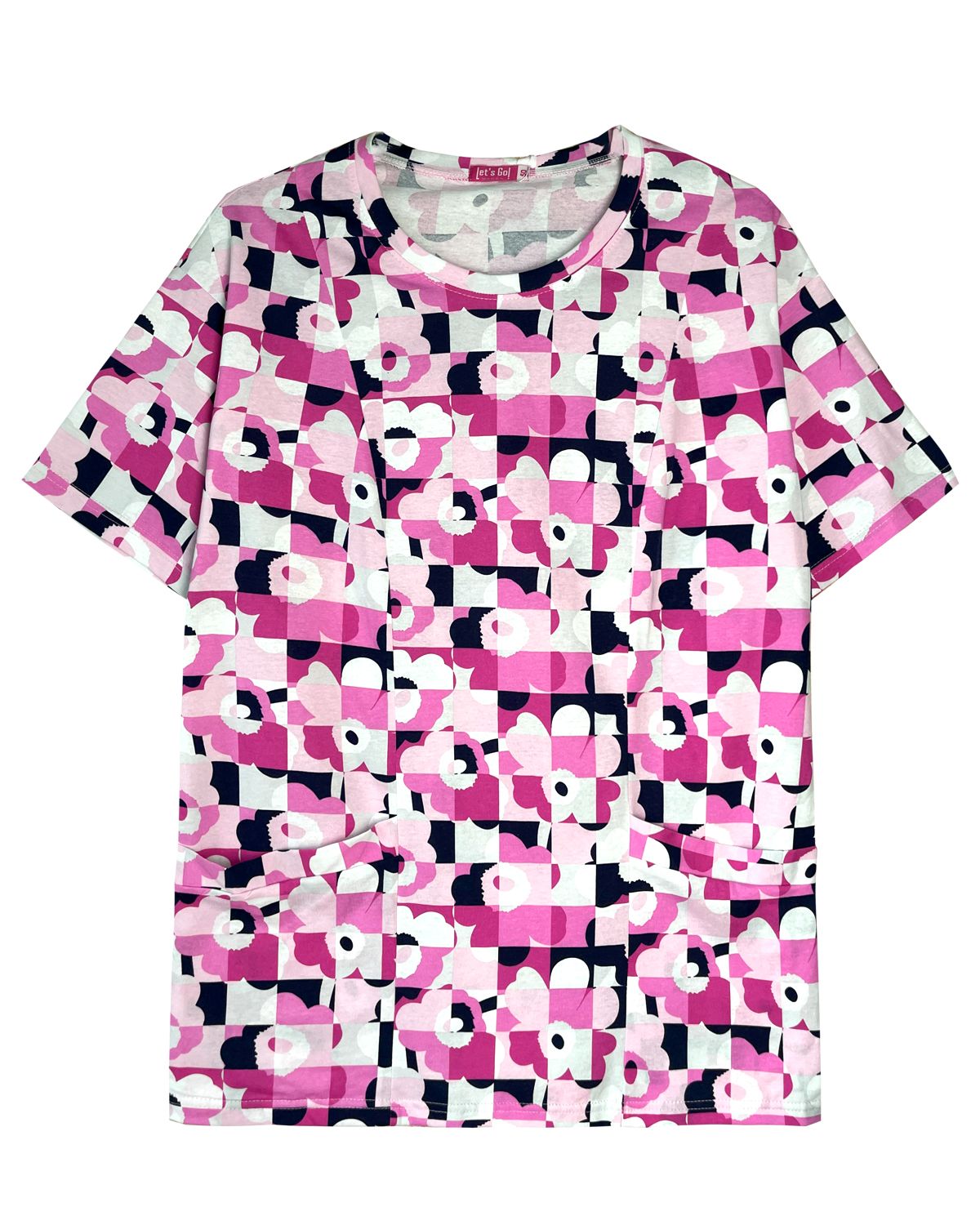 Футболка свободного силуэта из набивного полотна со спущенным плечом коротким рукавом и накладными карманами. Горловина круглая, обработана обтачкой из основного полотна. На передней полочке рельефыи накладные карманы с обтачкой. Низ изделия и рукавов обработан швом вподгибку. Модель рассчитана на рост 164-170см.