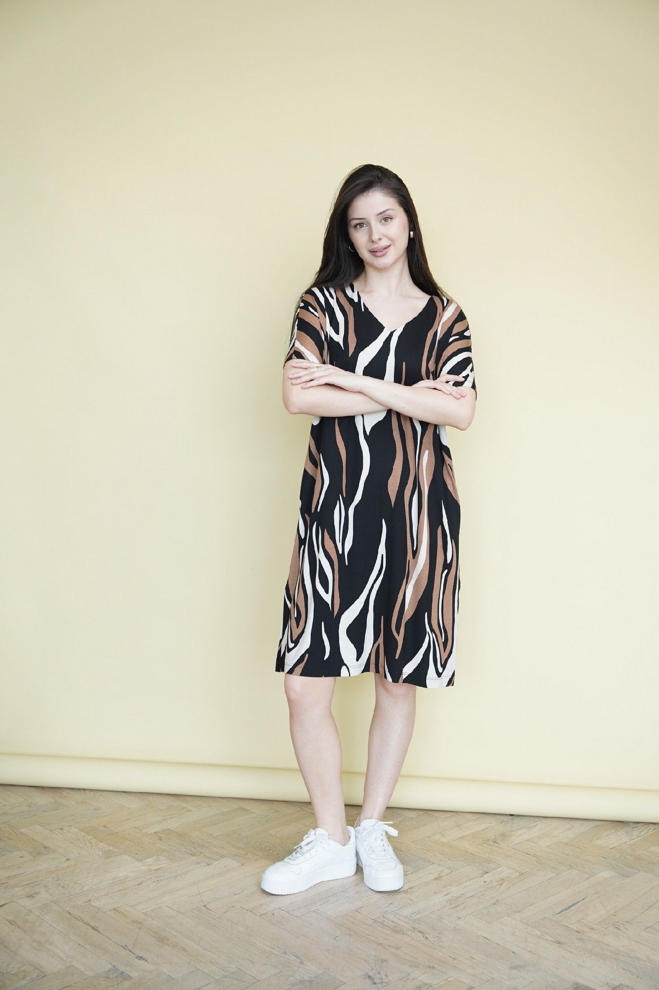 Платье женское из тканого полотна «искусственный шёлк полиэстер» с набивным рисунком, свободного покроя, удлиненное, по боковым швам расклешенное книзу, с V-образным вырезом горловины, окантованным основным материалом и короткими втачными рукавами.