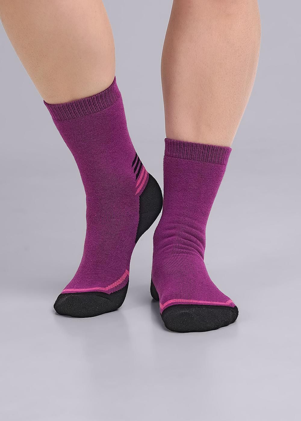 носки женские термо с яркими полосками для активного спорта и отдыха, махра по всему носку кроме резинки, резинка-лапша. Термо идет за счет ниточки полипропилен PROLENVEL. Пролен в разы теплее шерсти и хлопка, отлично отводит влагу и более долговечен. Добавление хлопка делает носки более приятным в носке.
