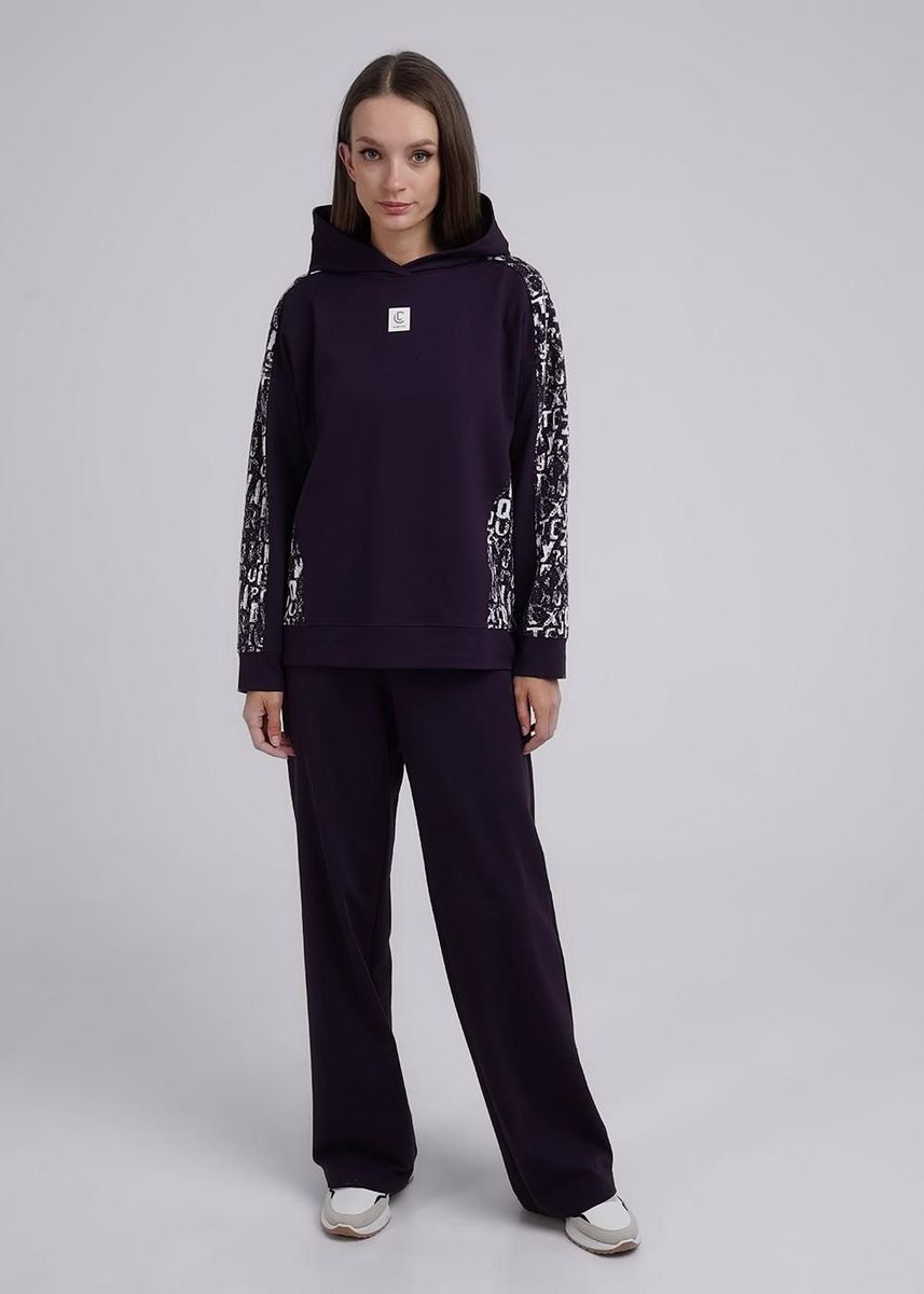 Джемпер свободного силуэта из трикотажного полотна двух видов, с капюшоном. Рукав реглан комбинированный с рельефами. По низу рукава и изделия притачной манжет. Спереди принт.