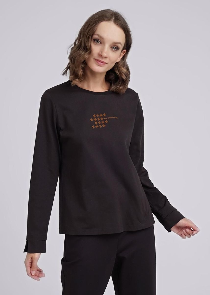 Фуфайка прямого силуэта из плотного хлопкового трикотажного полотна. Втачной длинный рукав, по низу рукава манжет с разрезом. Округлая горловина с обтачкой из рибаны. На детали переда термонаклейка.