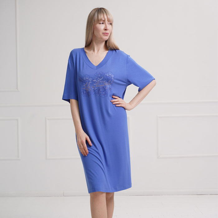 Сорочка женская из трикотажного полотна «кулирка» с набивным рисунком, расширенная книзу, без рукавов, с расширенной, углубленной горловиной овальной формы и притачной кокеткой по переду. Срезы пройм и горловины, а также шов притачивания кокетки, обработаны фасонной эластичной тесьмой с кружевным краем. Низ изделия обработан узкой обметочной строчкой.