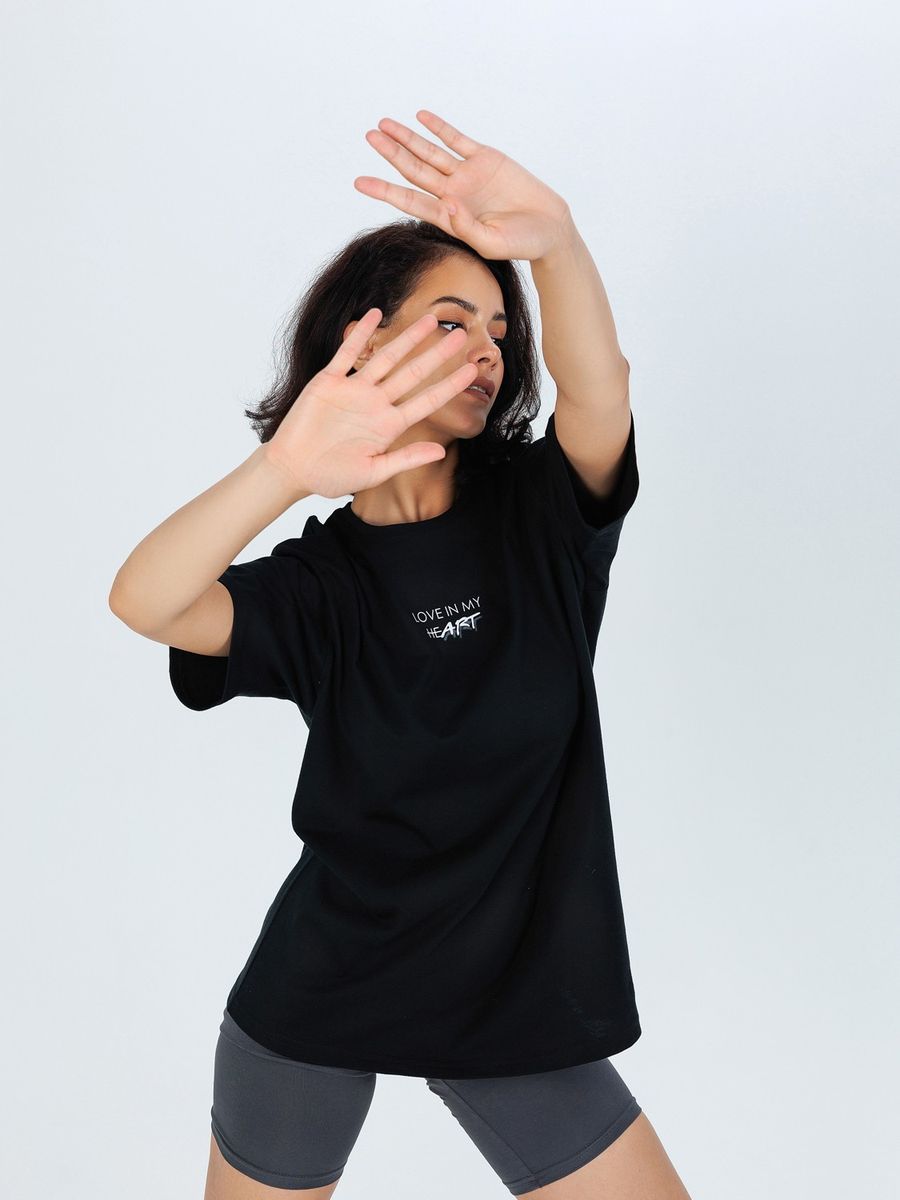 Футболка - молодежная из гладкокрашеного трикотажного полотна «кулирка», свободного покроя оверсайз, с короткими втачными рукавами, горловиной овальной формы, обработанной притачной бейкой, и принтом на полочке, выполненным в технике «шелкографии».
