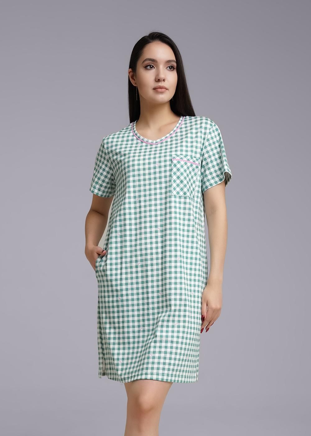 Платье для дома из хлопкового трикотажного полотна. На детали переда накладной карман с контрастным кантом. Короткий втачной рукав со спущенной линией плеча. V-образная горловина с обтачкой и контрастным кантом. Карманы в боковом шве. По бокам разрезы