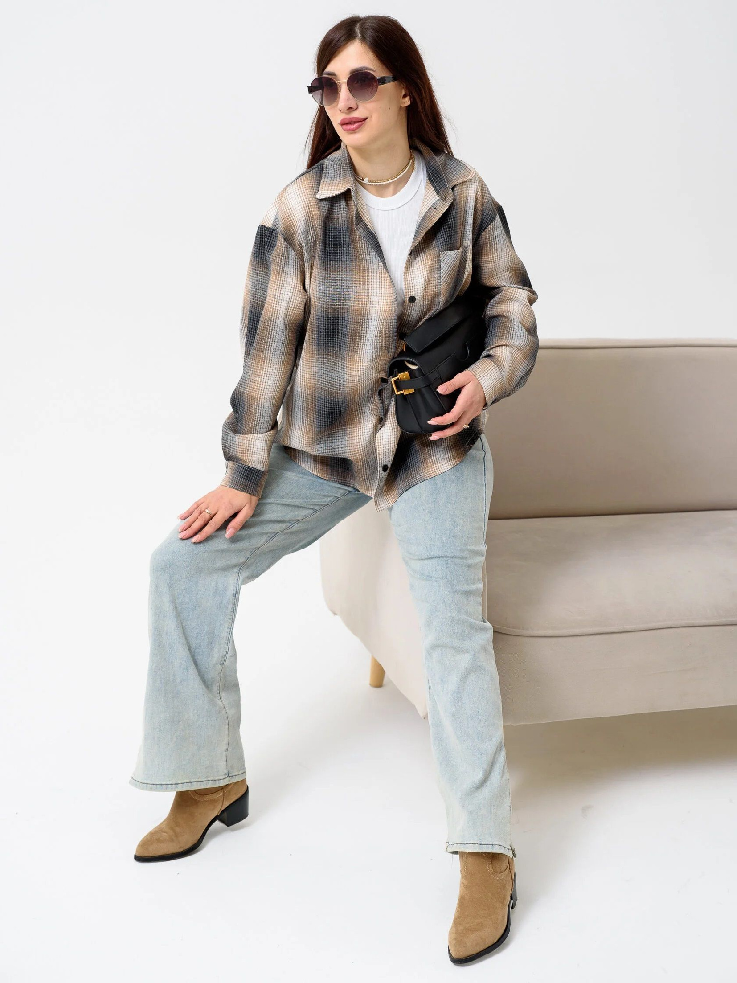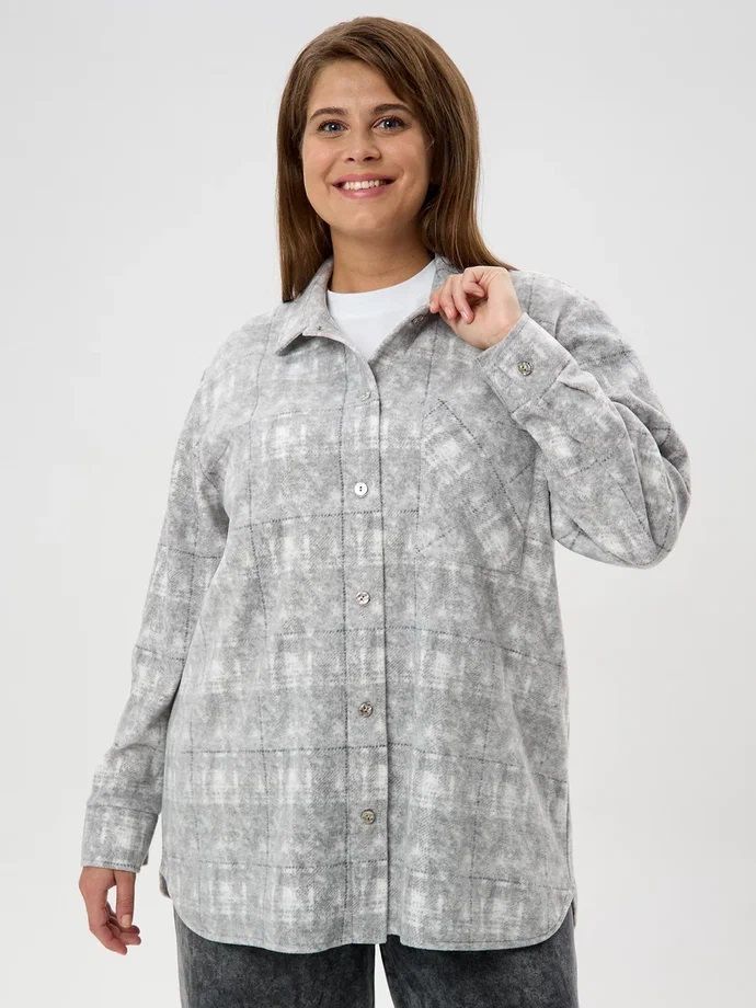 Рубашка (туника) молодежная из трикотажного полотна «флис» с эффектом «варенки», полуприлегающего силуэта, с длинными втачными рукавами на притачных манжетах, стояче-отложным воротником, нагрудным карманом, фигурным низом и центральной бортовой застежкой на петли и пуговицы. Спинка – с отрезной кокеткой и бантовой складкой в центре соединительного шва.
