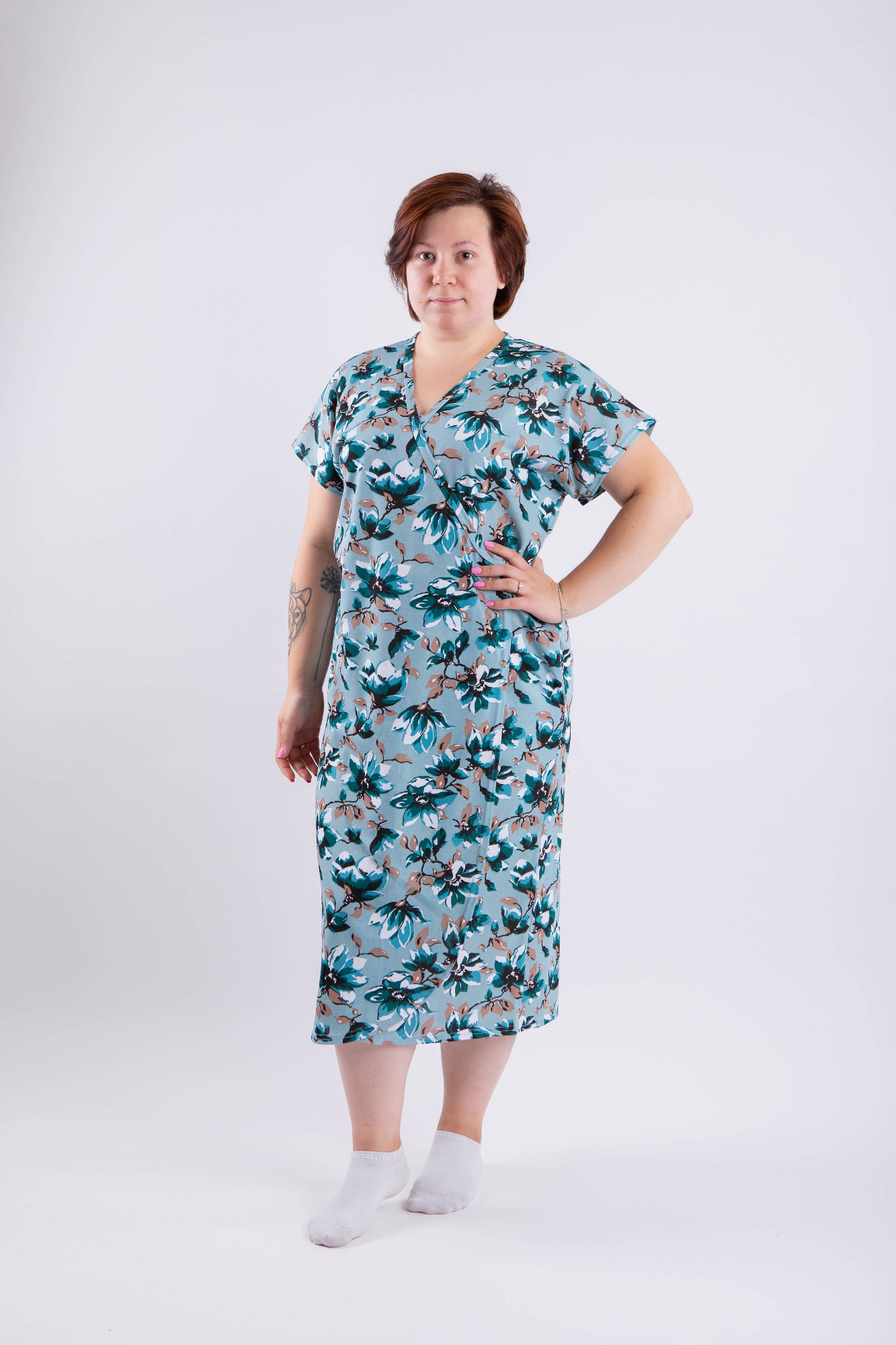 Удобный, просторный халат со складкой на спине. Модель актуальна для женщин с пышными формами, ценящими свободу движений