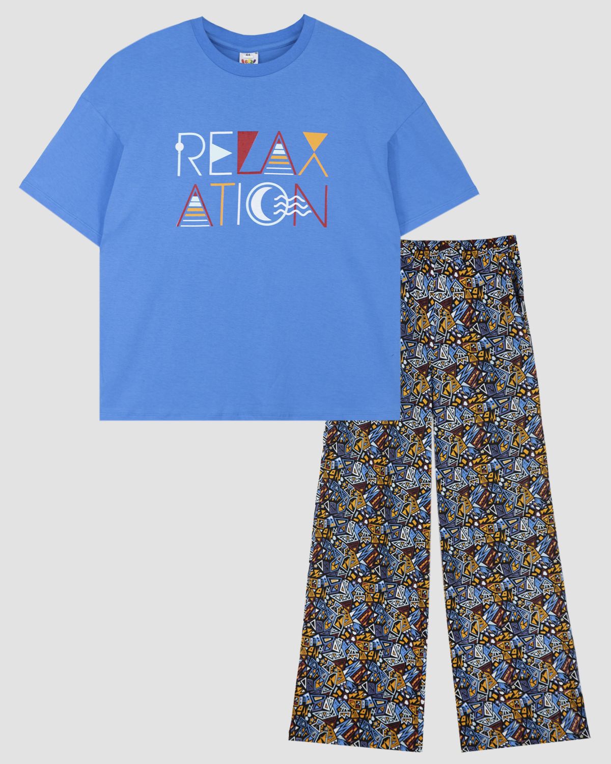 Пижама женская, состоящий из футболки и брюк палаццо. Футболка женская прямого силуэта с втачным коротким рукавом. Горловина круглая, обработана воротником из рибаны. Горловина спинки внутри обработана бейкой из основного полотна. Низ изделия и рукавов обработан швом вподгибку. На полочке принт ШЕЛКОГРАФИЯ. Надпись переводится как "Расслабление". Брюки палаццо из набивного полотна, с завышенной талией и широким кроем от бедра. На передних половинах брюк карманы с отрезным бочком. Модель рассчитана на рост 164-170.