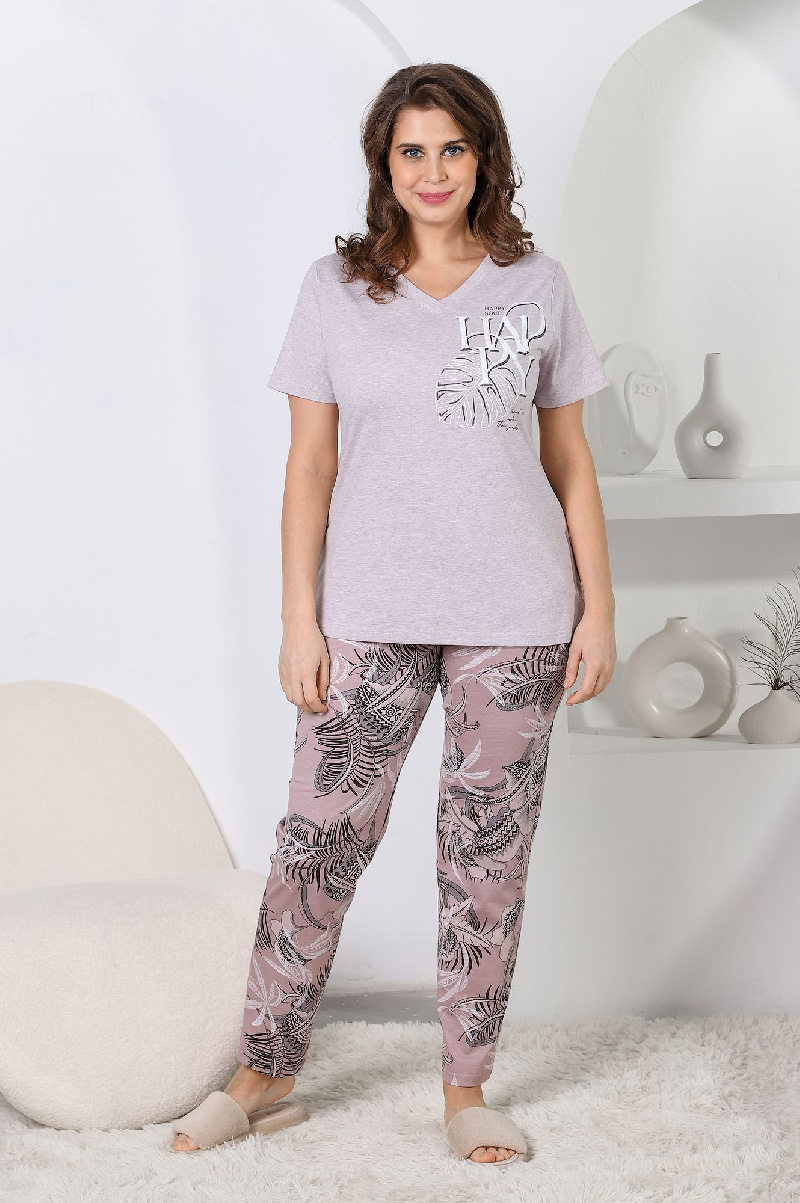 Костюм женский из трикотажного полотна «кулирка» в комбинации двух видов ткани, состоящий из футболки и брюк. Футболка из гладкокрашеного трикотажного полотна классического покроя, с короткими втачными рукавами, горловиной V-образной формы, обработанной втачной планкой и принтом на полочке, выполненным в технике «шелкографии».Брюки – из полотна с набивным рисунком, длинные, слегка зауженные книзу, на притачном поясе с эластичной тесьмой внутри, с карманами в боковых швах.