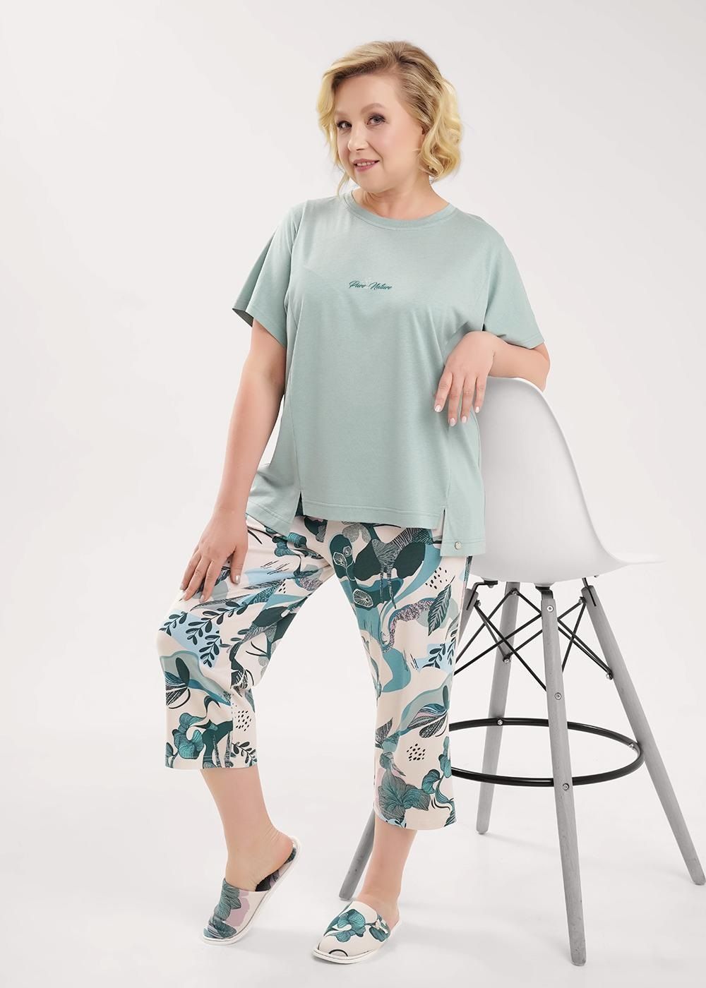 Набор одежды из трикотажного полотна с добавление модала.Футболка прямого кроя, цельнокроенный рукав.Округлая горловина с обтачкой. По переду вертикальные резы с разрезом, нашивка металл,спереди принт.Бриджы на резинке. Боковые карманы с отрезным бочком.