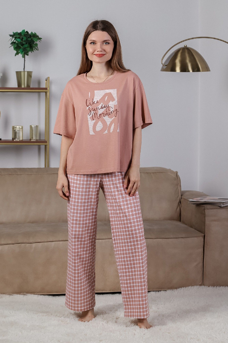 Пижама молодежная из трикотажного полотна «кулирка» в комбинации двух видов: гладкокрашеного и с набивным рисунком, состоящая из футболки и брюк. Футболка – из гладкокрашеного полотна, классического покроя, с короткими втачными рукавами, горловиной овальной формы, обработанной притачной бейкой и принтом на полочке, выполненным в технике «шелкографии».Брюки – из полотна с набивным рисунком, свободные классического покроя, с эластичной тесьмой по талии.