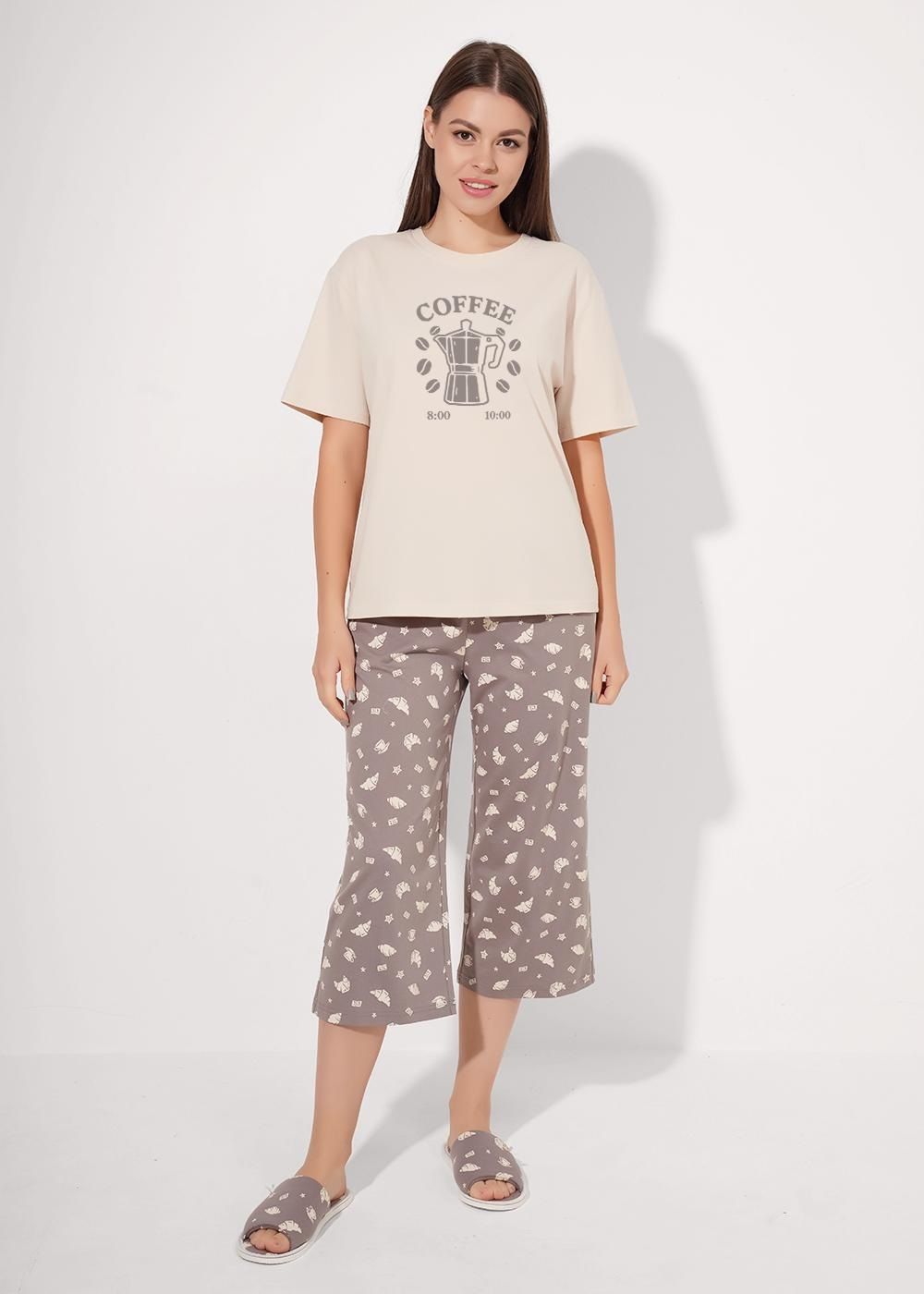 Набор одежды для дома и отдыха из хлопкового трикотажного полотна. Футболка прямого кроя. Короткий втачной рукав. Округлая горловина с обтачкой. Спереди принт. Бриджи с поясом на внутренней резинке, спереди нашивка. Боковые карманы с отрезным бочком.
