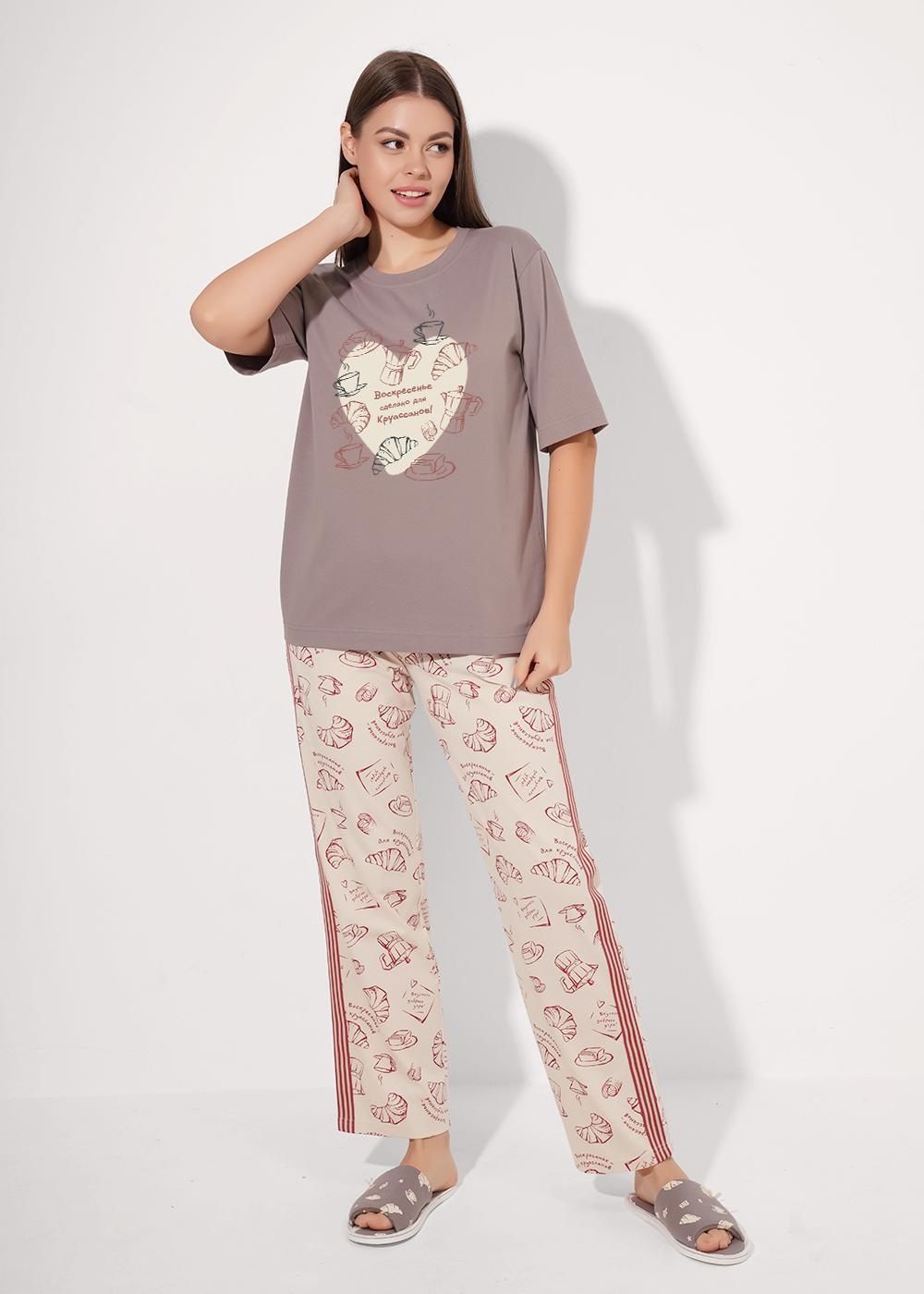 Набор одежды для дома и отдыха из хлопкового трикотажного полотна. Футболка прямого кроя. Короткий втачной рукав. Округлая горловина с обтачкой. Спереди принт. Брюки с поясом на внутренней резинке, по боковому шву -лампас из тесьмы, спереди нашивка.