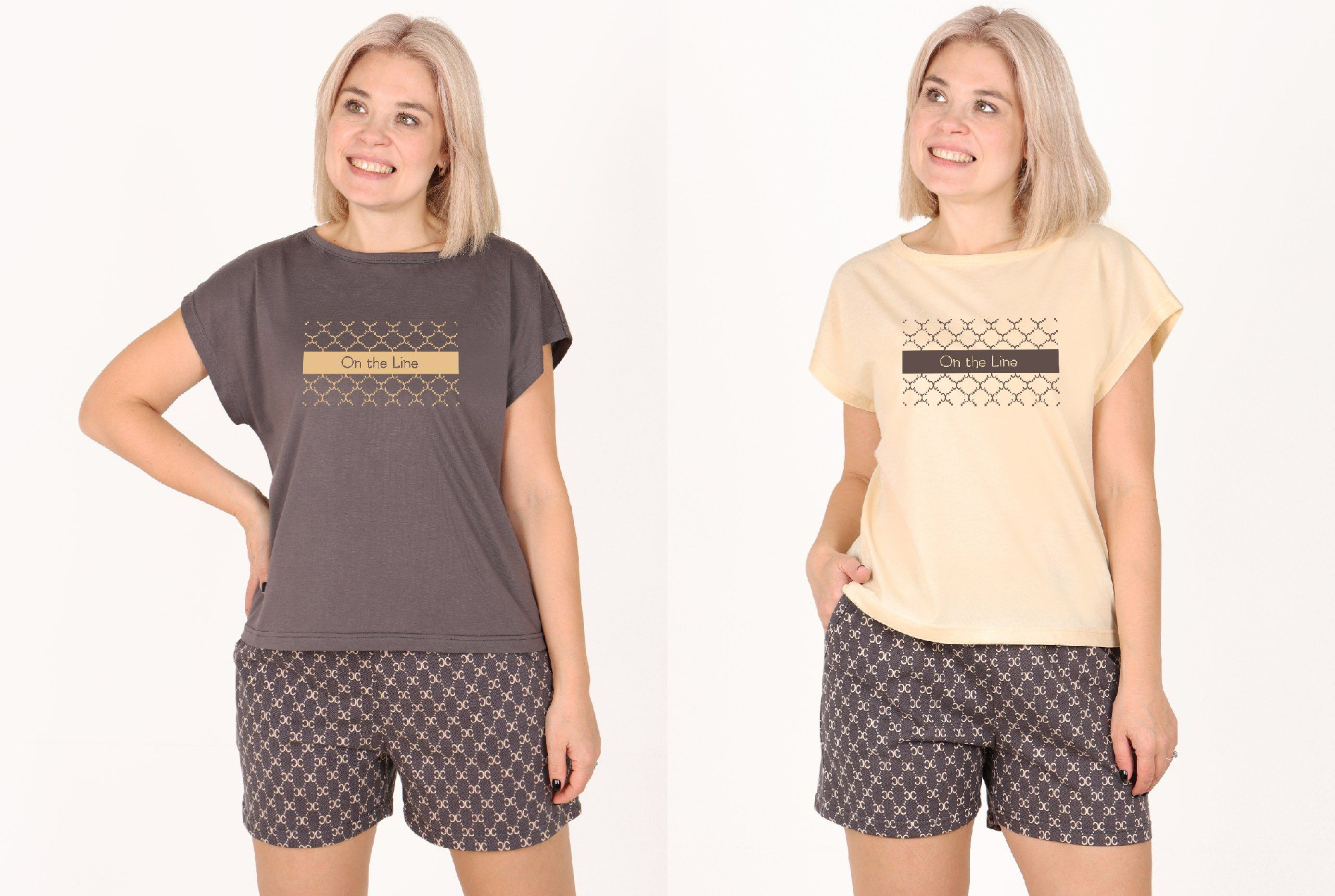 Костюм женский из трикотажного полотна в комбинации двух видов: полотна "!кулирка-кармеланж" и полотна "кулирка" с набивным тематическим рисунком на сером фоне , состоящий из футболки и шорт. Футболка - модного силуэта, слегка укороченная свободного покроя, с приспущенным плечом, с втачными короткими рукавами , горловиной овальной формы, обработанной втачной планкой и принтом в центре переда. По шву втачивани я планки настрочена декоративная (5-ниточная) отделочная строчка нитками контрастного цвета Подгибка низа рукавов и изделия так же выполнена с применением декоративной отделочной строчки. Шорты выполнены из полотна с набивным темкатическим рисунком, свободного покроя, средней длины, с эластичной тесьмой по талии.