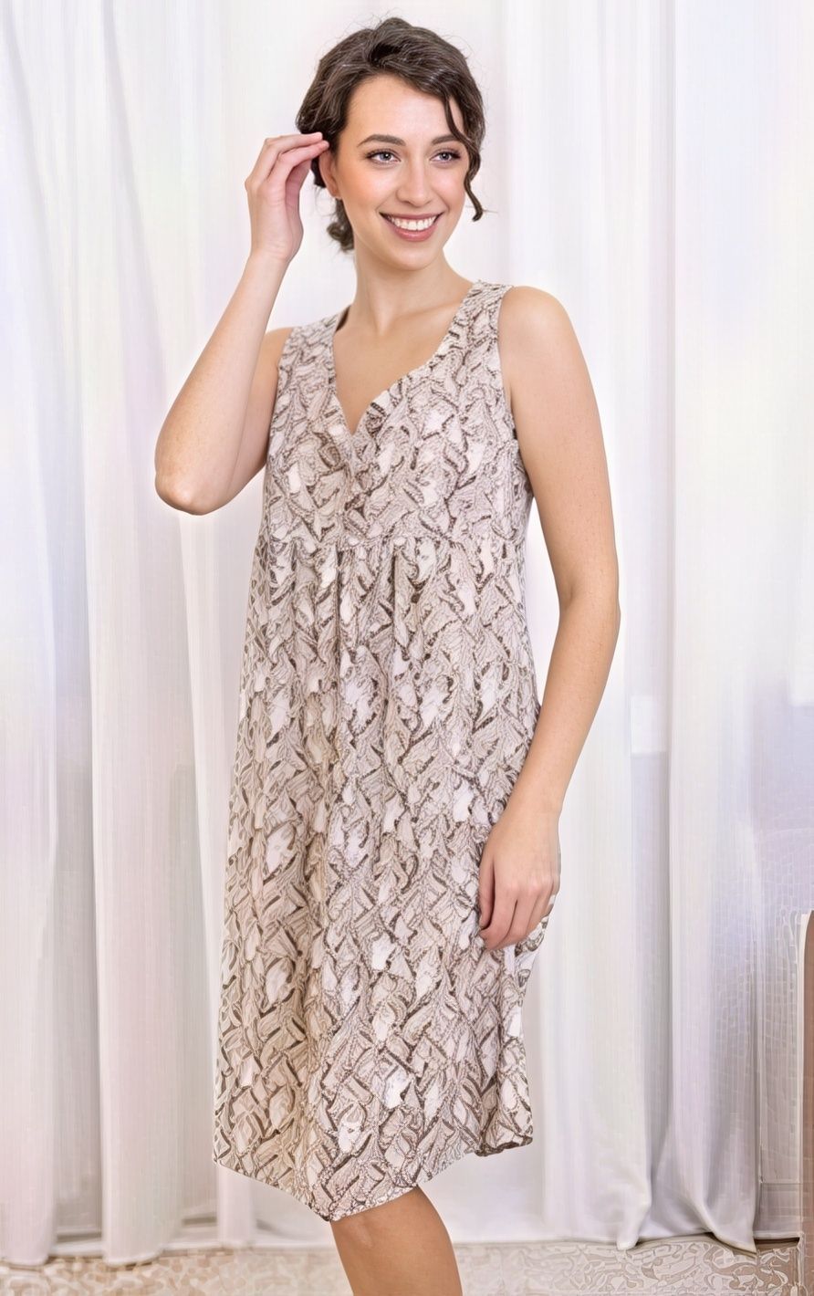 Сорочка женская из трикотажного полотна «кашкорсе» с набивным рисунком, слегка расширенная книзу, с короткими втачными рукавами, углубленной формой горловины. Низ изделия и нижние срезы рукавов обработаны эластичной тесьмой с фасонным краем.