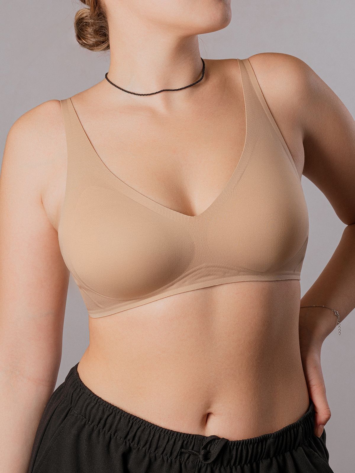 Бюстгальтер бесшовный изготовлен из полиамида, выполнен в молочном цвете. Бюстгальтер не имеет жестких деталей, поэтому отличается повышенным комфортом. Закрытые чашки с поролоновыми вставками. Тонкие бретели регулируются. Сзади имеется застежка на крючки 4х2.