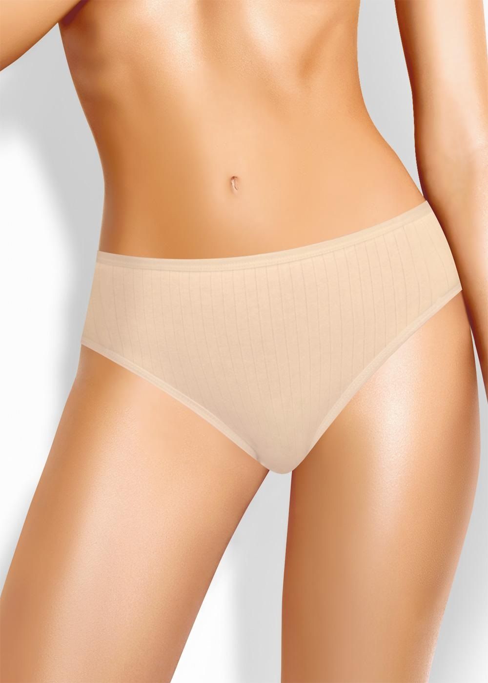 Трусы бикини женские из эластичного хлопкового полотна. Обработка краев по талии - окантовка с застилом, по ноге - полуокантовка.