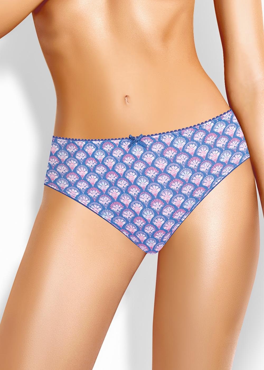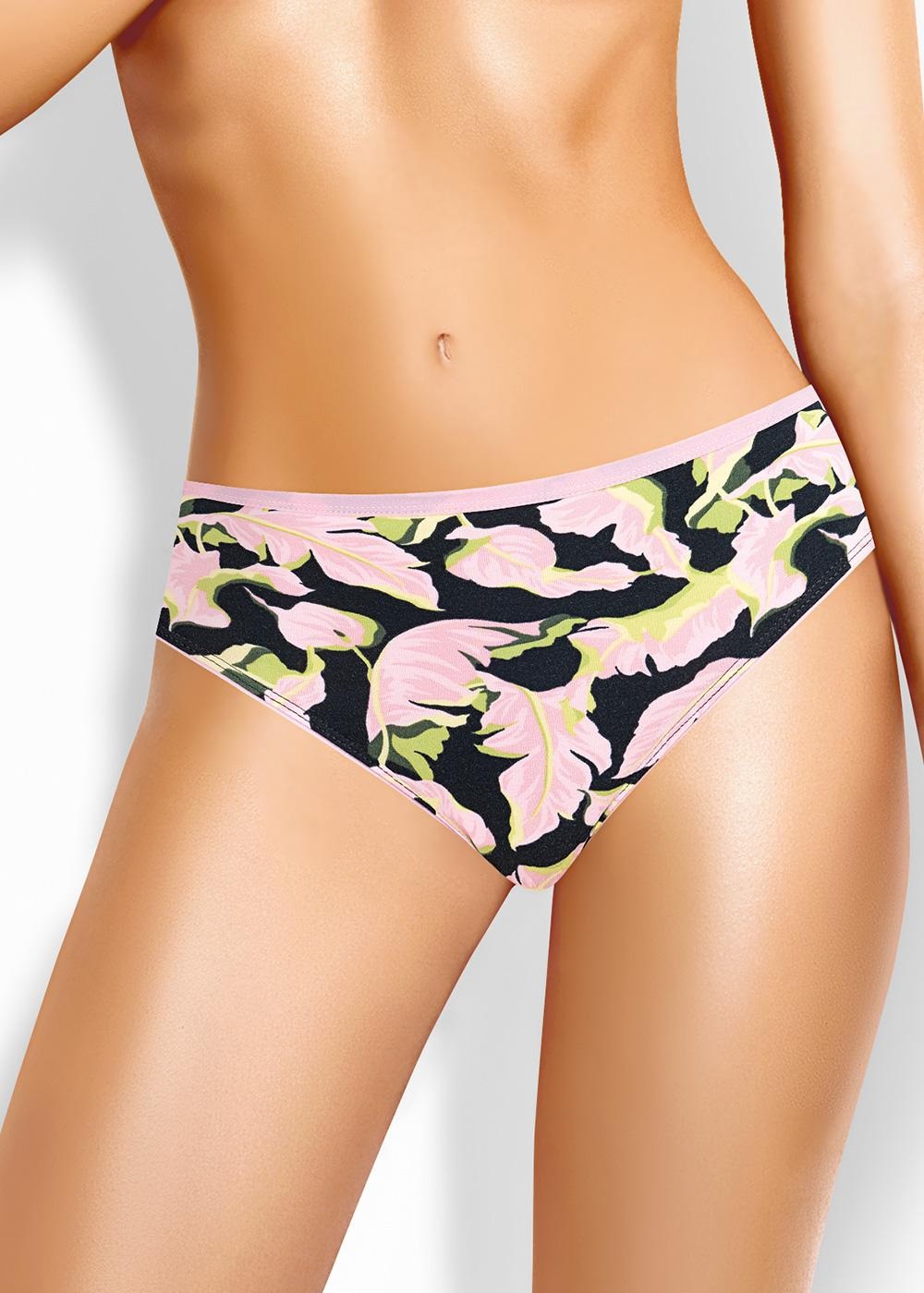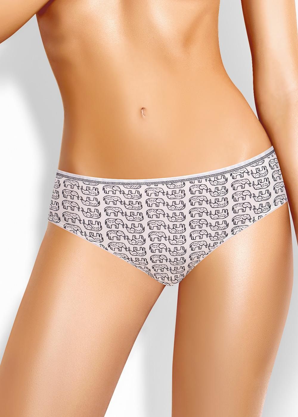 Трусы бикини женские из эластичного хлопкового полотна. Обработка краев по талии - окантовочная резинка с застилом, по ноге - полуокантовка. Спереди принт.