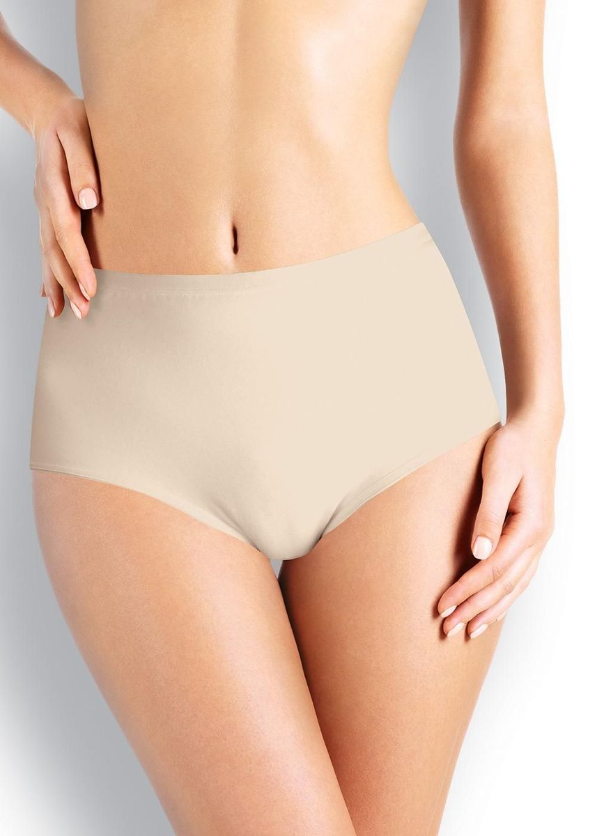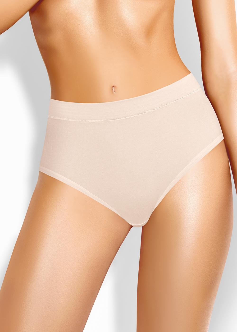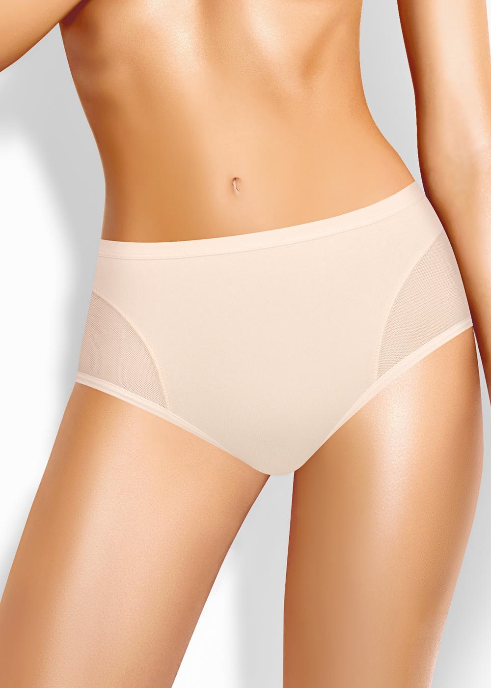 Трусы макси женские из эластичного хлопкового полотна. Обработка краев по талии жаккардовая резинка, по ноге - полуокантовка. По переду боковые вставки из сетки, швы застилом.