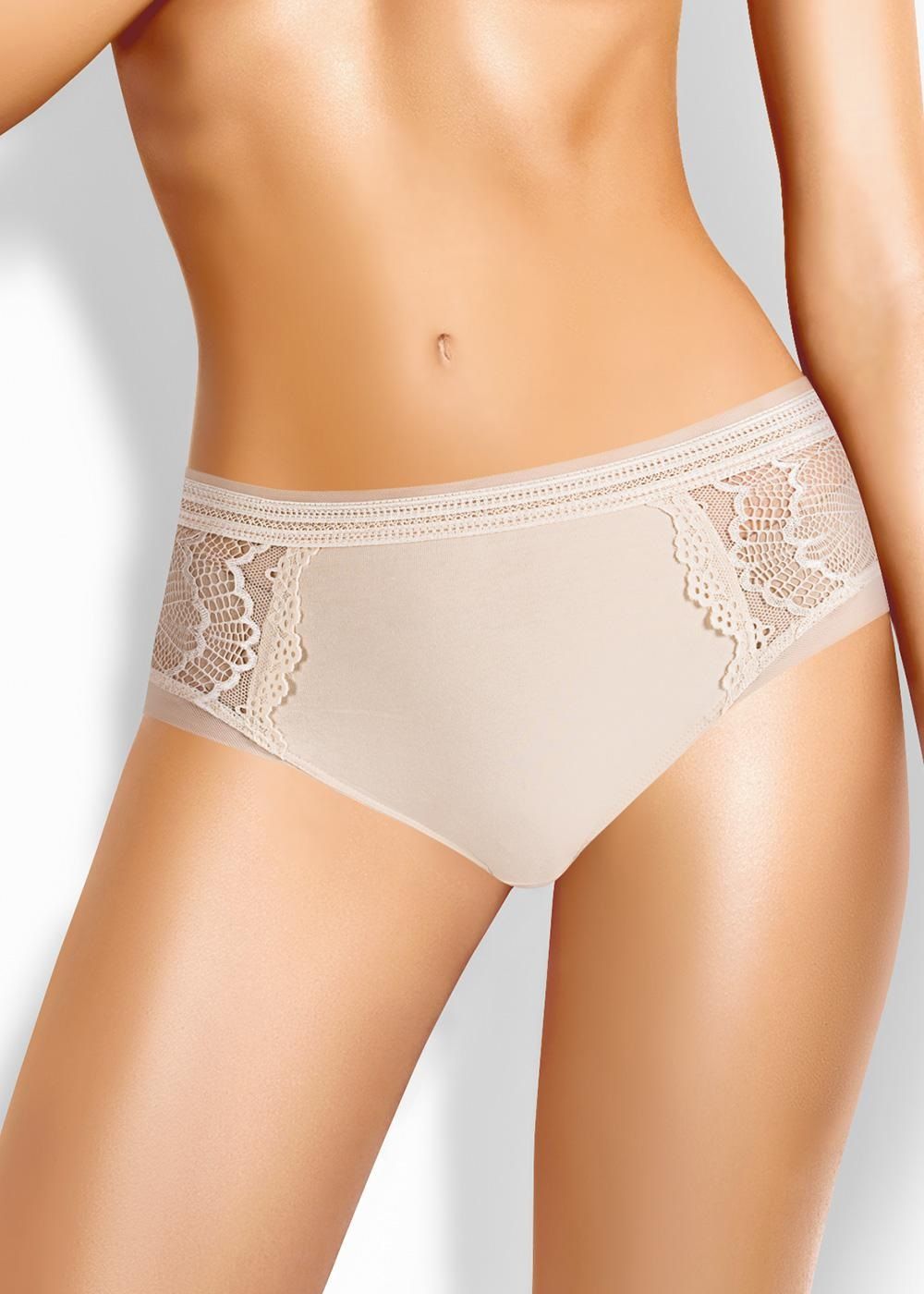 Трусы бикини женские из эластичного хлопкового полотна. По бокам вставки из кружева. Обработка краев по талии - сеткой с ажурной резинкой, по ноге - сеткой с узкой окантовкой.