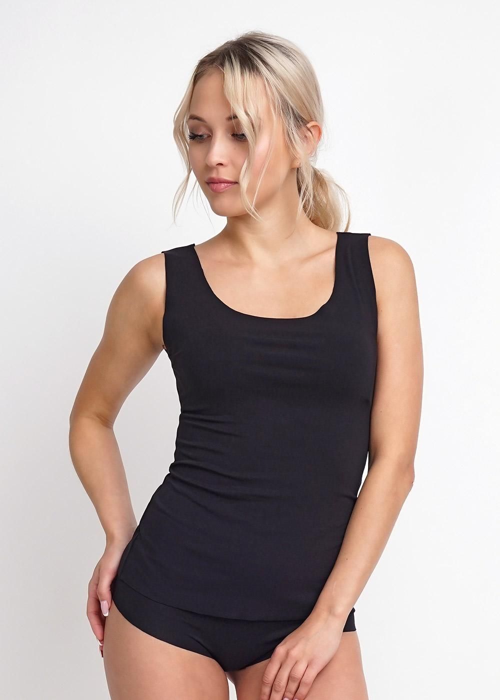 Майка женская из эластичного полотна с хлопком и модалом в составе. Узкая бретель. Круглый вырез горловины. Фирменный силиконовый логотип.