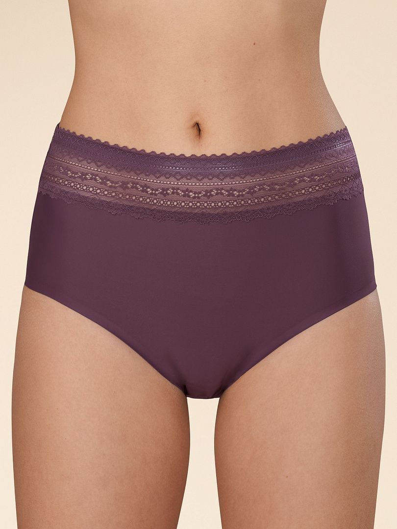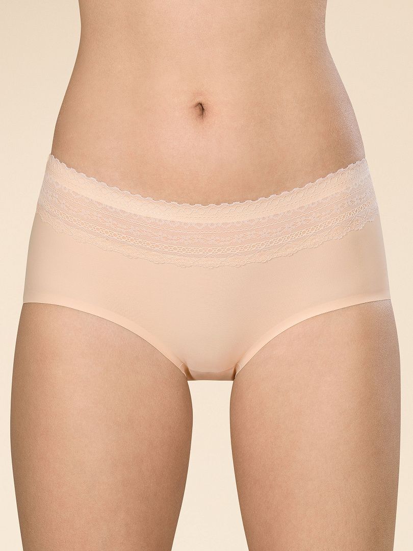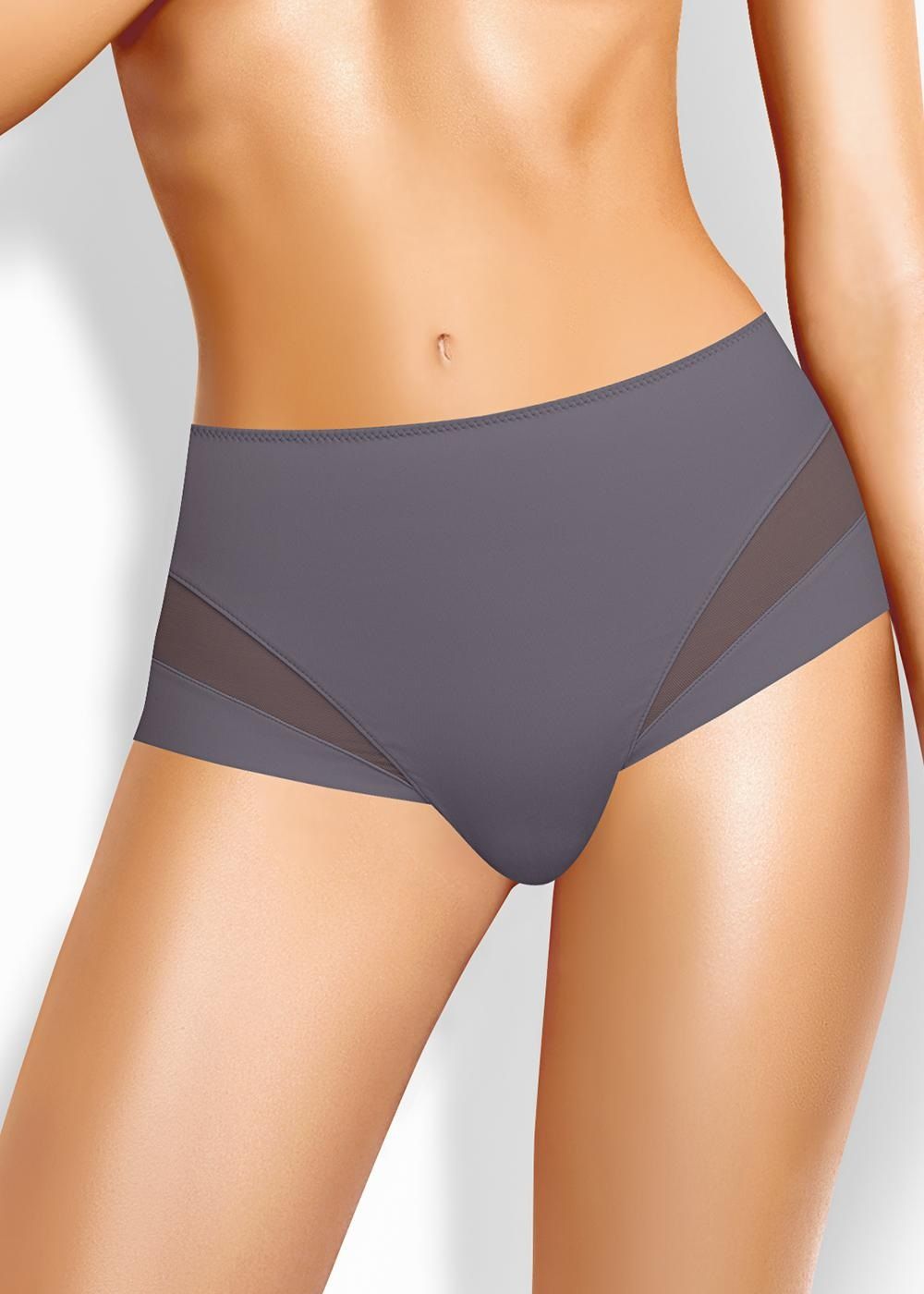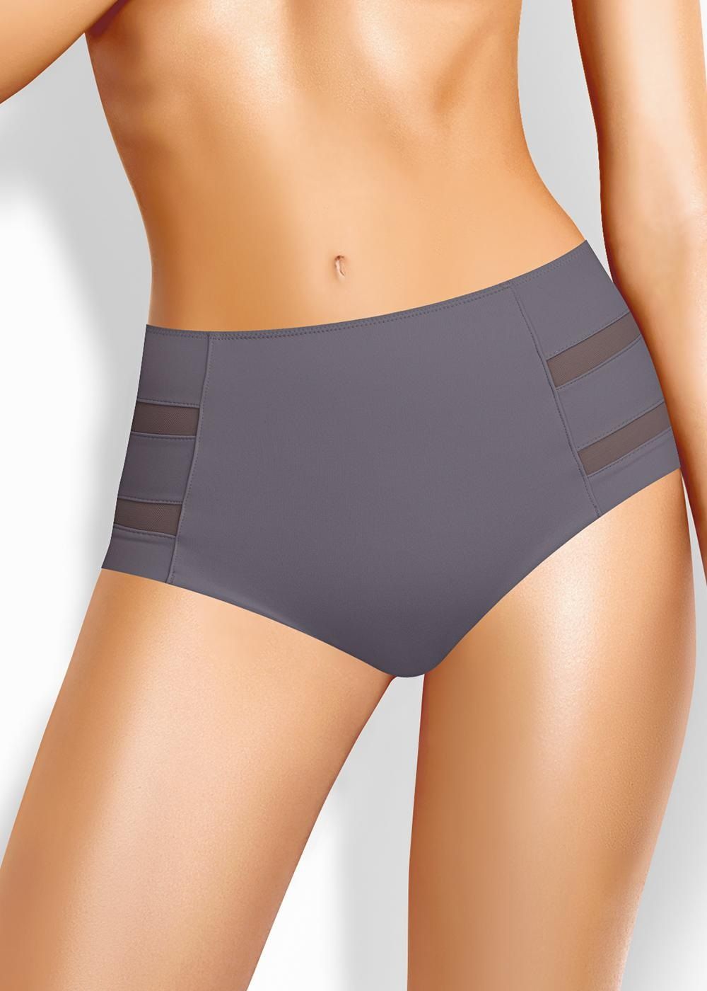 Трусы слипы с завышенной посадкой, сзади и по линии бикини бесшовная гладкая обработка, спереди декоративные диагональные вставки из плотной сетки, перед дублирован сеткой, по талии обработка с зигзагом и узкой резинкой