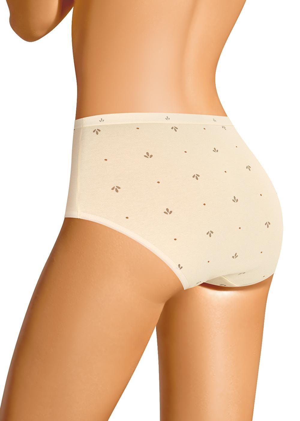 Трусы макси женские из эластичного хлопкового полотна. Обработка краев по талии резинка с принтом, по ноге - полуокантовка. По переду резы с двойной центральной частью.