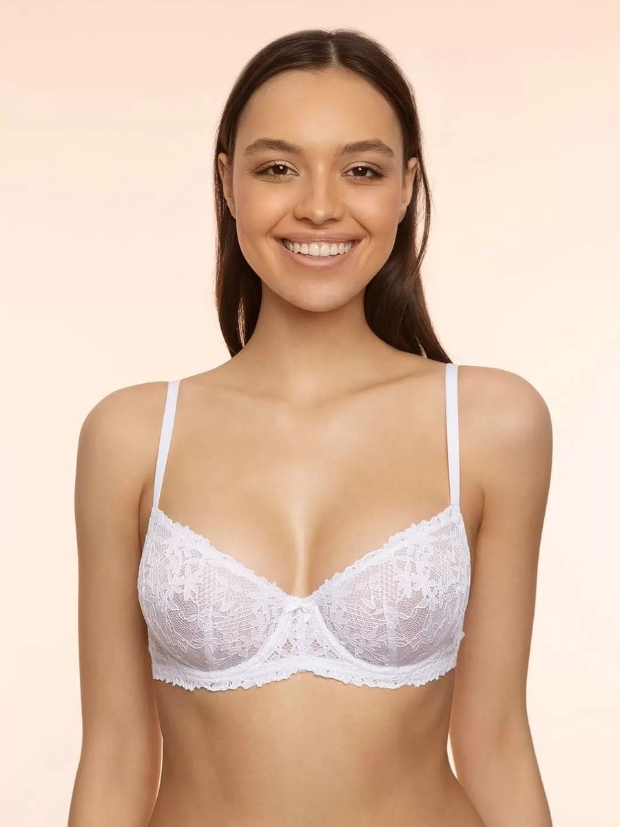 Бюстгальтер с поролоновой чашкой дублированной хлопком от бренда Madamoda. Фактурное кружево, декорирующее чашки изделия, плавно переходит в удобные широкие бретели, идеально поддержит и придаст нужную форму счастливым обладательницам пышного бюста.