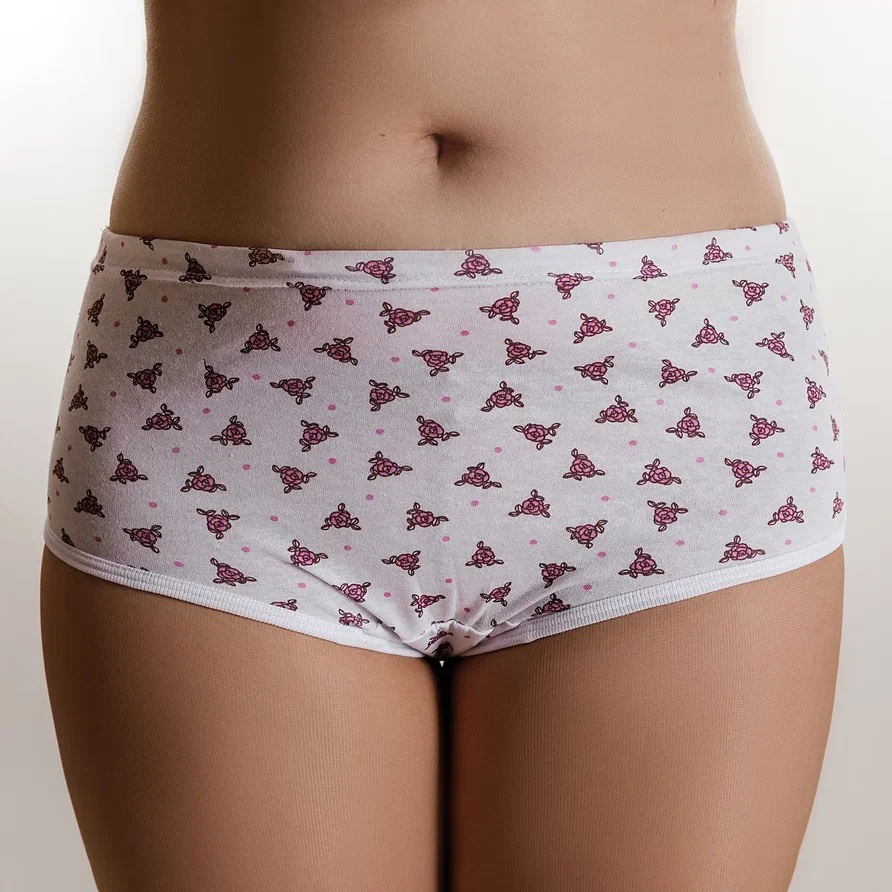 Трусы макси женские из плотного эластичного хлопкового полотна. Обработка краев - окантовка. По переду дополнительный слой из трикотажного жаккардового полотна.