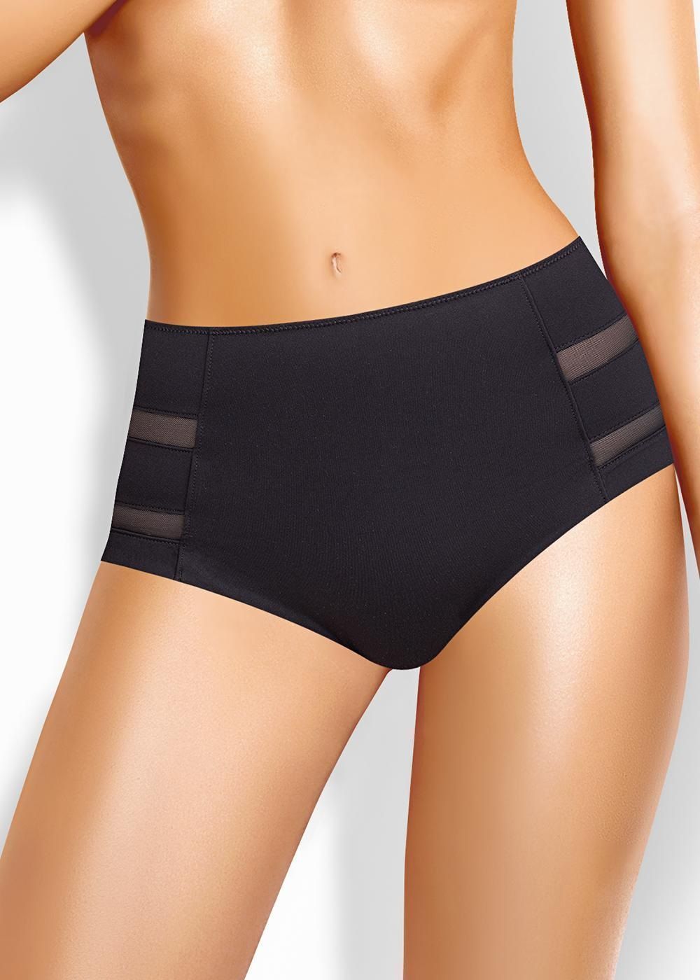 Трусы слипы с завышенной посадкой, сзади и по линии бикини бесшовная гладкая обработка, спереди декоративные диагональные вставки из плотной сетки, перед дублирован сеткой, по талии обработка с зигзагом и узкой резинкой