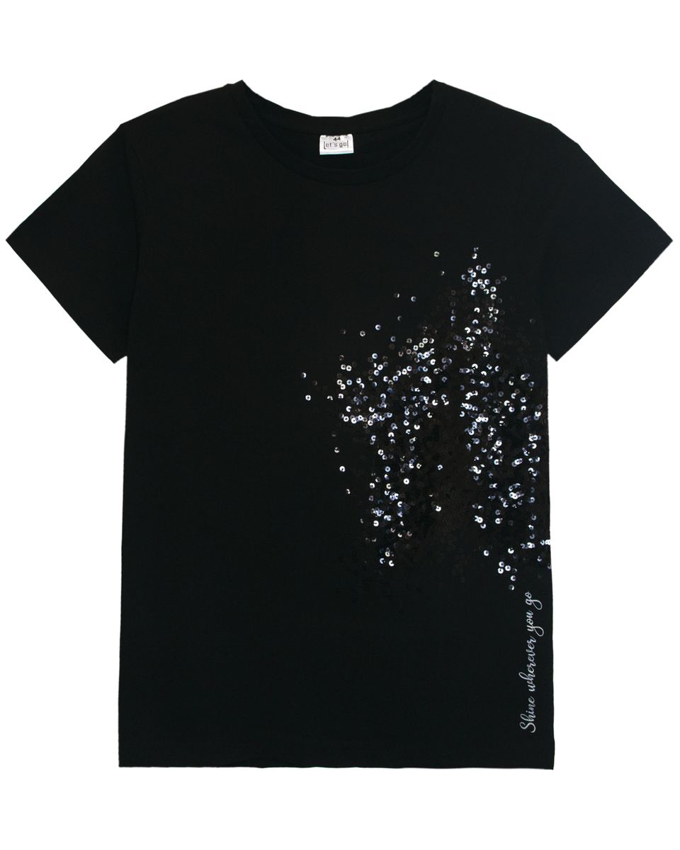 Футболка женская прямого силуэта с втачным коротким рукавом. Горловина круглая, обработана воротником из кулирки. Горловина спинки внутри обработана настрочной планкой из кулирки. Низ изделия и рукавов обработан швом вподгибку. На полочке принт шелкография с глиттером + вышивка пайетками. Модель рассчитана на рост 164-170см.