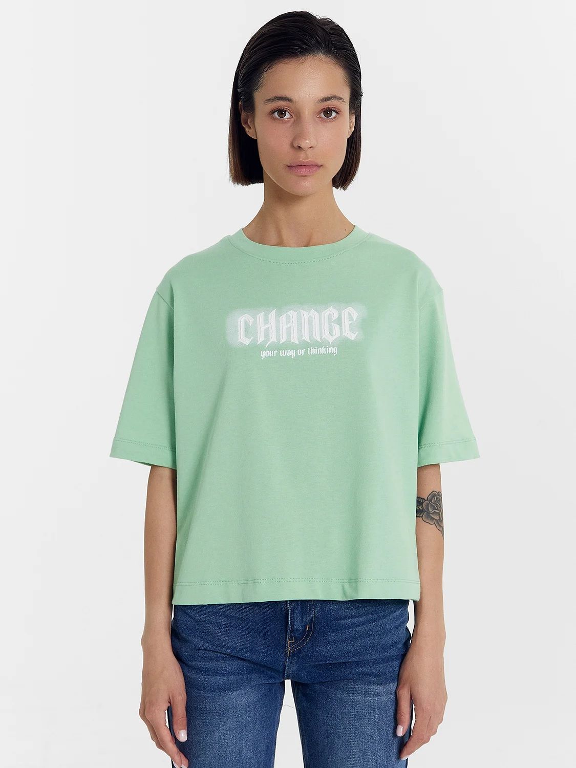Футболка женская (оверсайз) свободного силуэта, с коротким рукавом. Горловина круглая, обработана воротником из рибаны. Горловина спинки внутри обработана бейкой из кулирки. Низ изделия и рукавов обработан швом вподгибку. На полочке принт ШЕЛКОГРАФИЯ С ГЛИТТЕРОМ. Надпись переводится как "Оптическая иллюзия". Модель рассчитана на рост 164-170см.