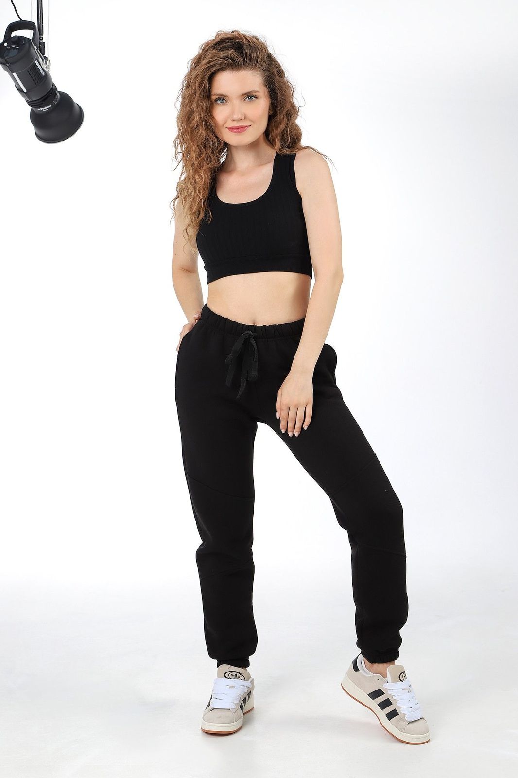 Брюки из трикотажного меланжированного полотна «футер-трехнитка», длинные, с карманами в боковых швах и эластичной тесьмой по талии. Передние половины – из трех частей каждая. Нижние срезы обработаны подгибкой с эластичной тесьмой. В подгибку верхнего среза через две обметанные петли для регулирования степени прилегания брюк по талии вставлен шнур, завязывающийся спереди.