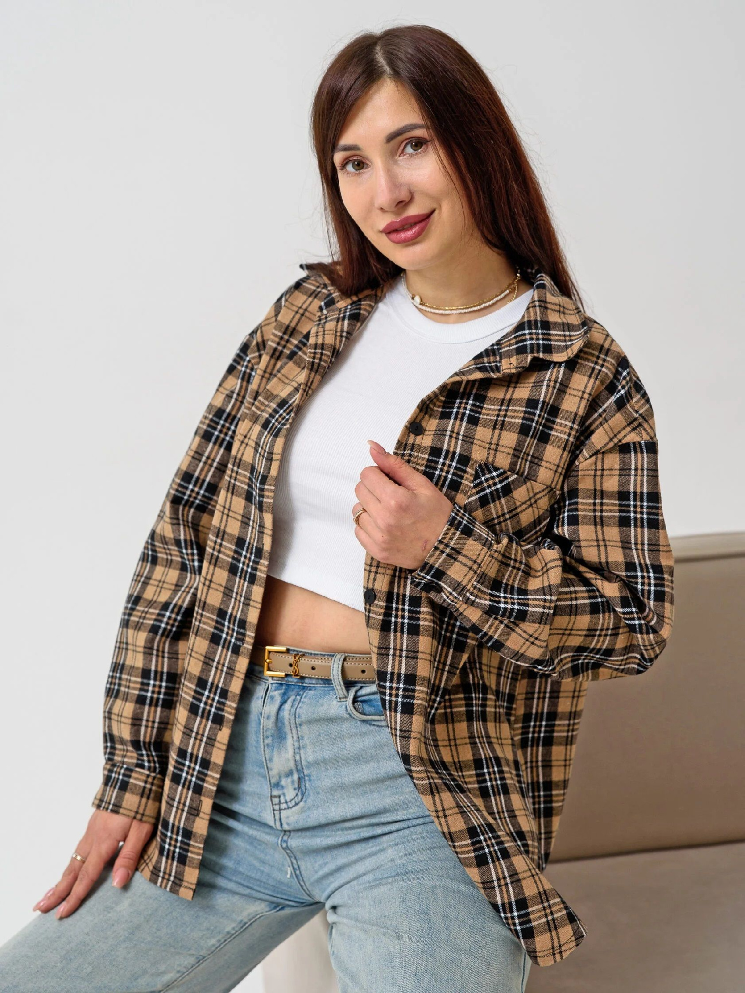 Рубашка (туника) женская из трикотажного полотна «флис» с набивным рисунком «клетка», свободного силуэта, с длинными втачными рукавами напритачных манжетах, стояче-отложным воротником, нагрудным карманом,фигурным низом и центральной бортовой застежкой на петли и пуговицы. Спинка – с отрезной кокеткой и бантовой складкой в центре соединительного шва.
