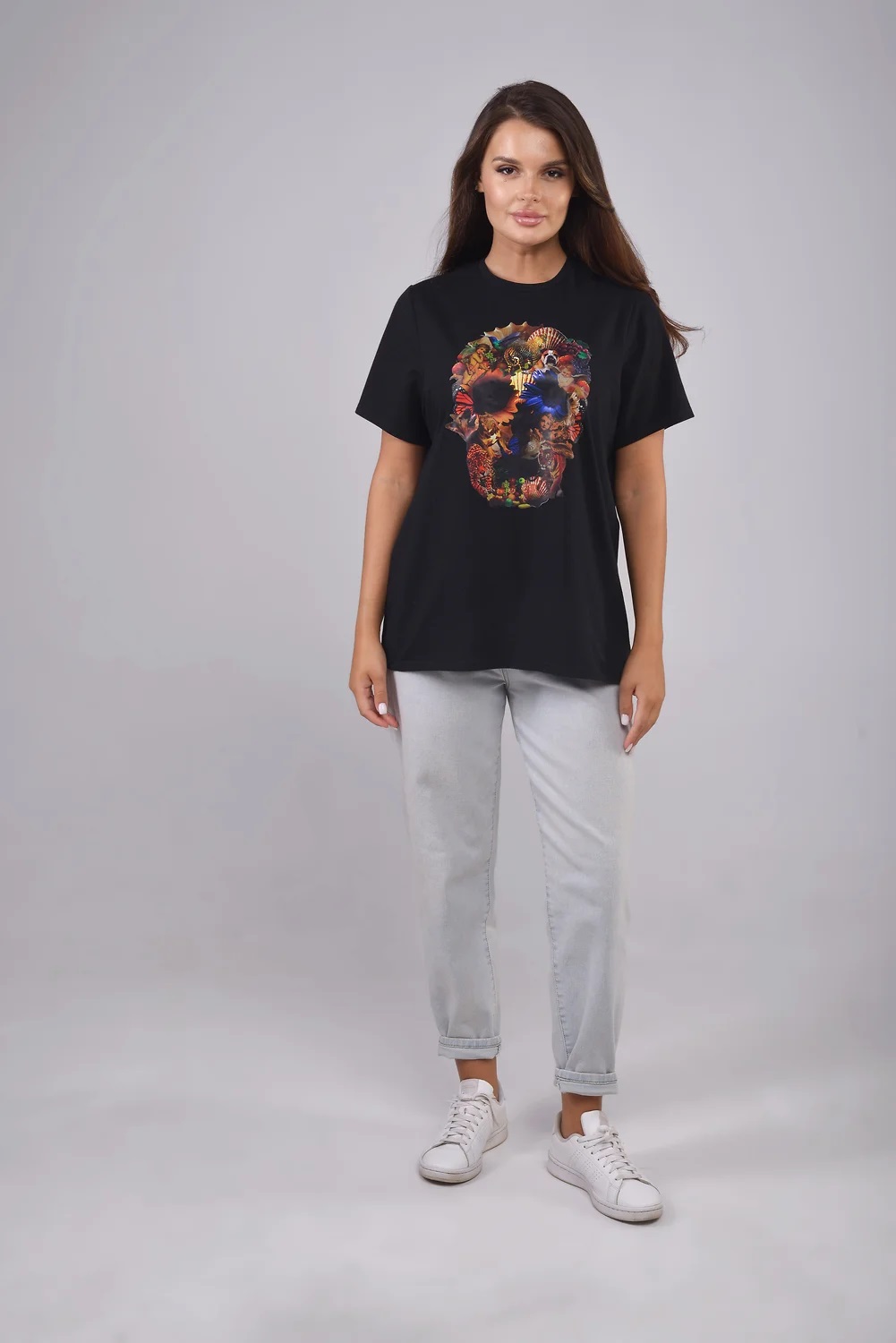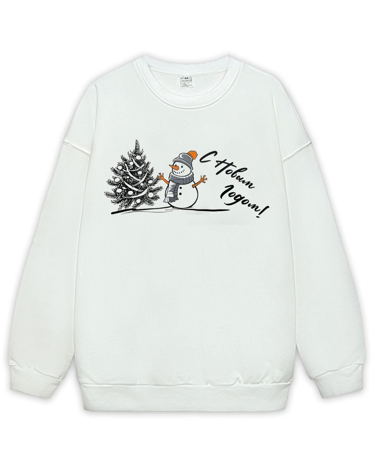 Джемпер взрослый, свободного кроя со спущенной линией плеча и длинным рукавом. Горловина круглая, обработана обтачкой из кашкорсе. По пройме и рукаву отделочная строчка на плоскошовной машине, припуск смотрит на полочку и спинку. Низ рукава и низ изделия заканчивается манжетом из кашкорсе. На полочке принт DTF.