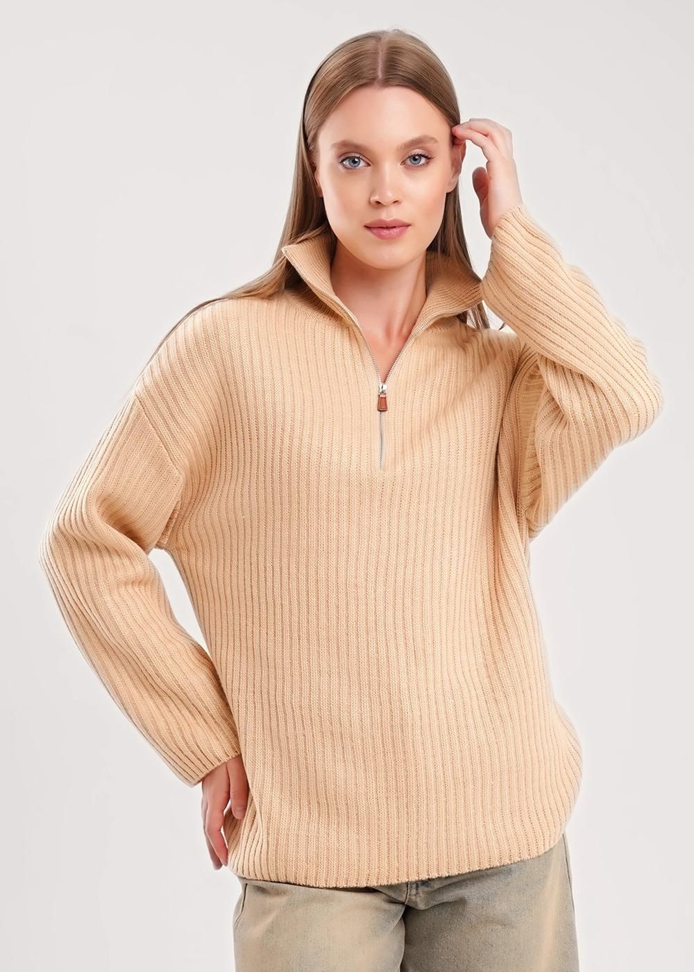 Вязаный джемпер умеренного объема из акриловой пряжи с добавлением шерсти, переплетения полуфанг. Спущенный длинный рукав. По горловине стойка с застежкой на молнию.