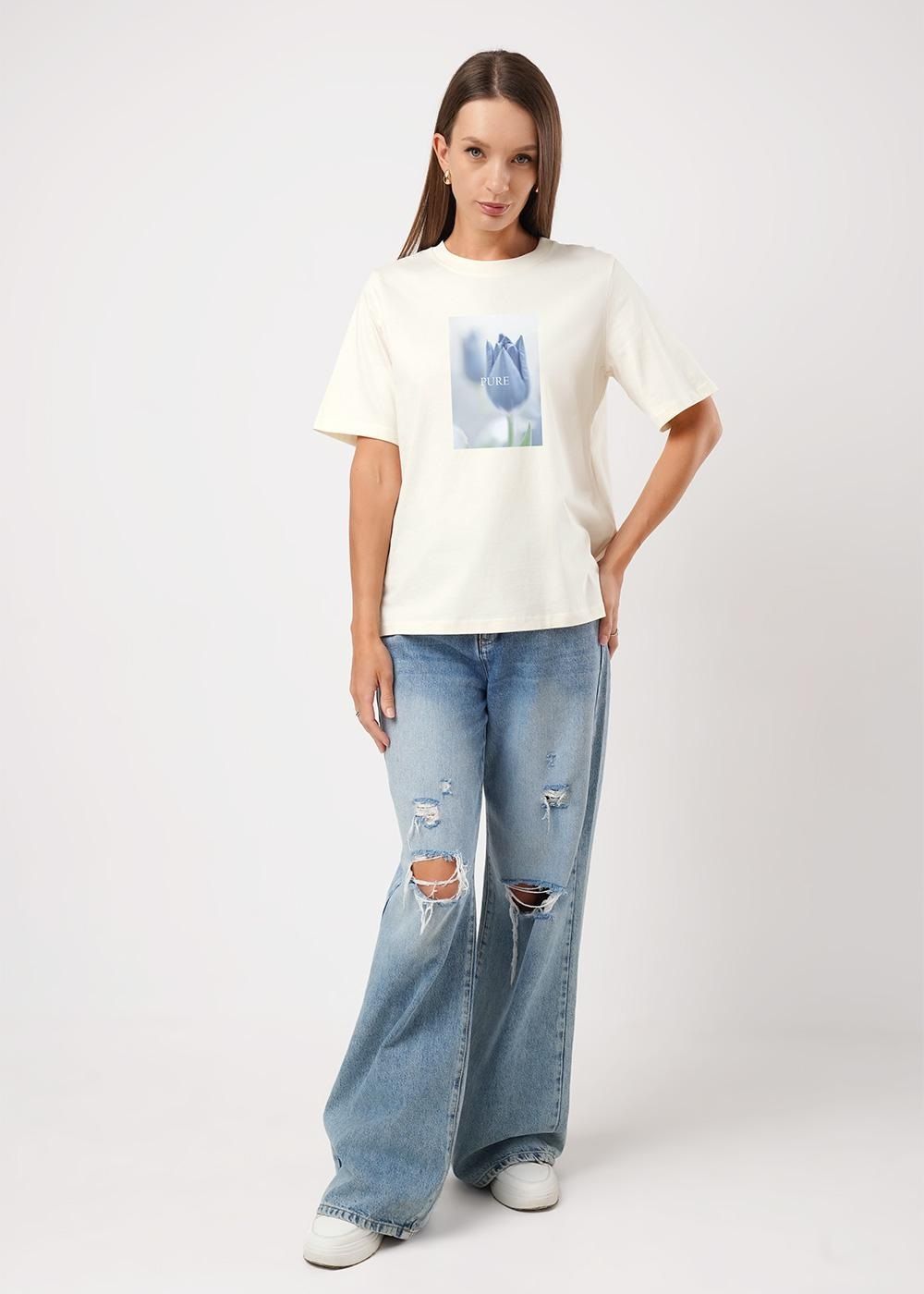 Футболка удлиненная из хлопкового трикотажного полотна. Округлая горловина с обтачкой из рибаны, короткий втачной рукав. По бокам разрезы. Спереди фото принт.
