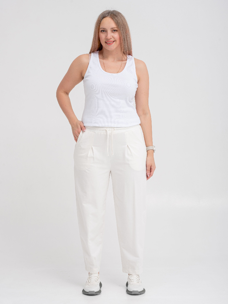 Брюки женские "бананы" зауженные к низу. Пояс отрезной в цвет изделия, выполнен из основного полотна, с эластичной тесьмой внутри. По поясу шорт вставлен плоский утягивающий шнурок, шириной 0,8 см, цвет серый меланж, низ шнурка подвернут и застрочен. Вдоль пояса шнурок закреплен отстрочкой на поясной машине. На изделии выполнены карманы с отрезным бочком и отлетной мешковиной, вход в карман обтачной. По линии талии передней половинке встречная складка зстрочена 6 см, нитки в цвет изделия. По низу брюк 2 вытачки по передней половинке и 2 вытачки по задней половинке, стачиваются на прямой строчке, нитки в цвет изделия. Низ изделия обработан швом вподгибку. Модель рассчитана на рост 164-170