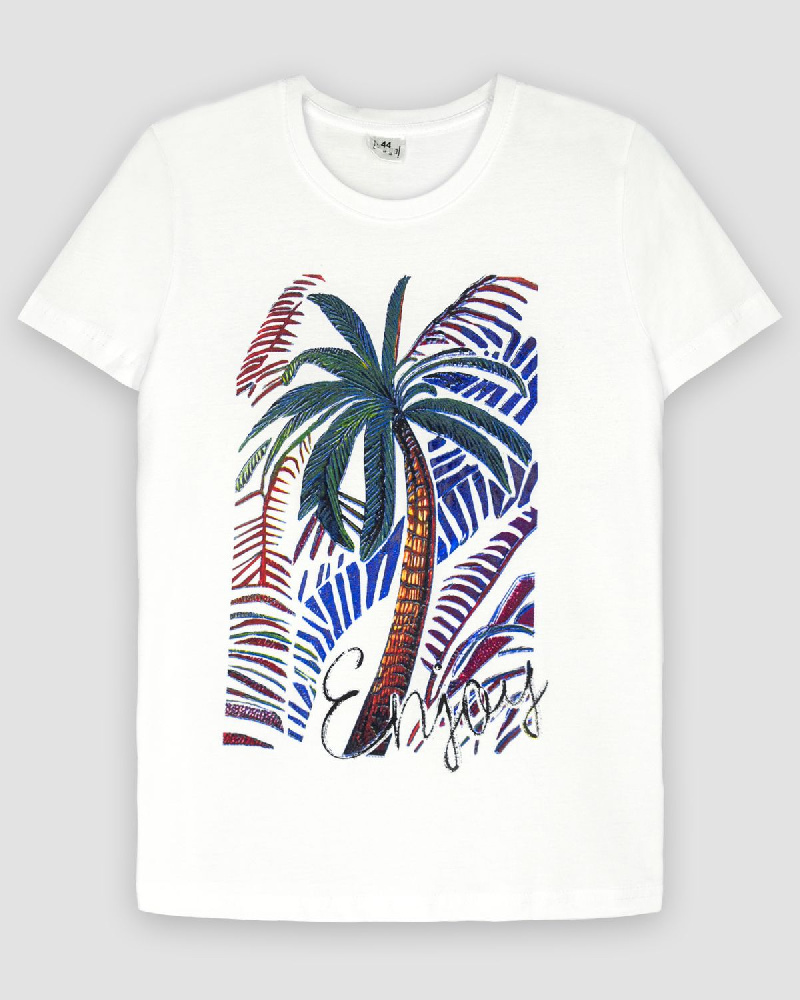 Футболка женская прямого силуэта с втачным коротким рукавом. Горловина круглая, обработана воротником из рибаны. Горловина спинки внутри обработана бейкой из кулирки. По горловине полочки отделочная строчка. Низ изделия и рукавов обработан швом вподгибку. На полочке Фотопринт. Надпись переводится как "Наслаждение". Модель рассчитана на рост 164-170см.