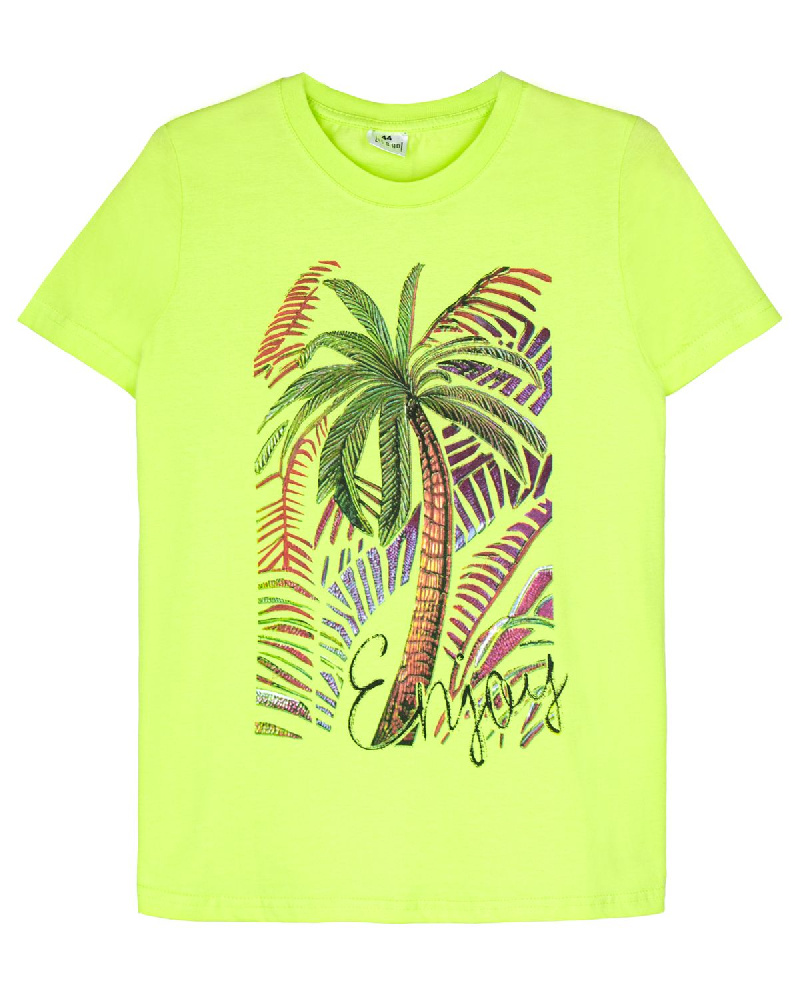 Футболка женская прямого силуэта с втачным коротким рукавом. Горловина круглая, обработана воротником из рибаны. Горловина спинки внутри обработана бейкой из кулирки. По горловине полочки отделочная строчка. Низ изделия и рукавов обработан швом вподгибку. На полочке Фотопринт. Надпись переводится как "Наслаждение". Модель рассчитана на рост 164-170см.