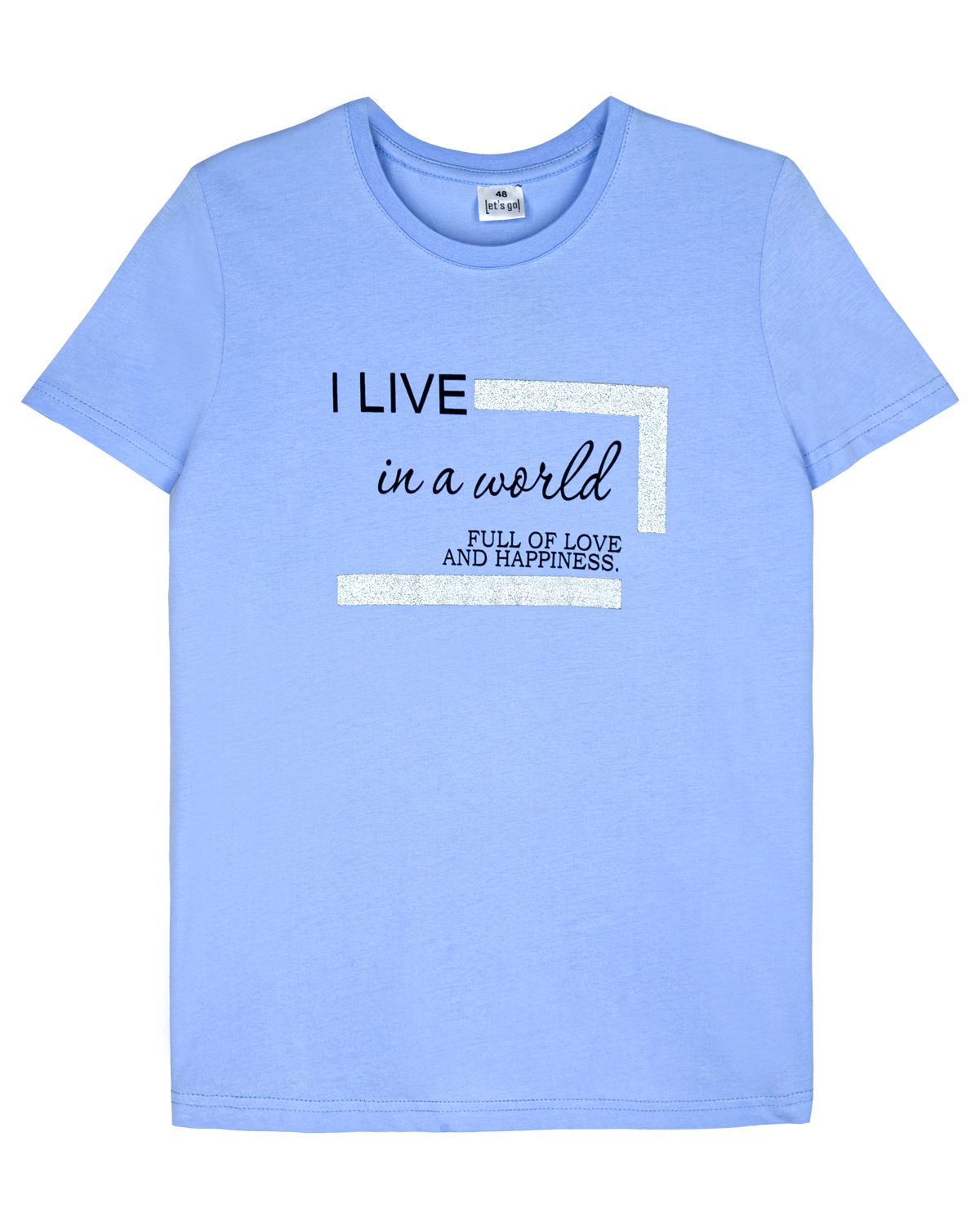 Футболка женская прямого силуэта с втачным коротким рукавом. Горловина круглая, обработана воротником из рибаны. Горловина спинки внутри обработана бейкой из кулирки. По горловине полочки отделочная строчка. Низ изделия и рукавов обработан швом вподгибку. На полочке принт Шелкография с глиттером. Надпись переводится как "Я живу в мире полном любви и счастья". Модель рассчитана на рост 164-170см.
