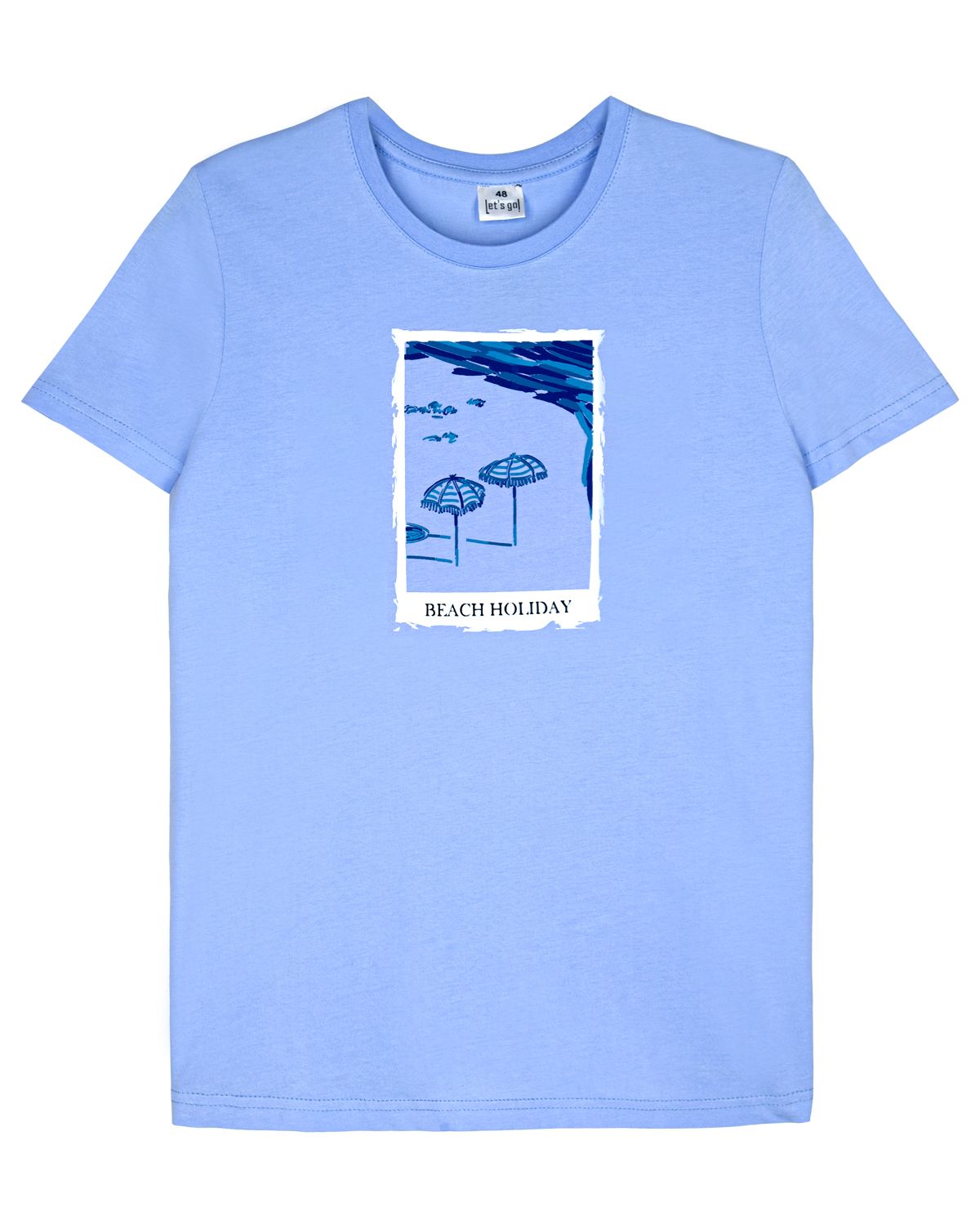 Футболка женская прямого силуэта с втачным коротким рукавом. Горловина круглая, обработана воротником из рибаны. Горловина спинки внутри обработана бейкой из кулирки. По горловине полочки отделочная строчка. Низ изделия и рукавов обработан швом вподгибку. На полочке принт Шелкография. Надпись переводится как "Пляжный отдых". Модель рассчитана на рост 164-170см.