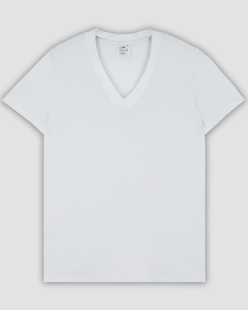 Футболка женская прямого силуэта с втачным коротким рукавом. Горловина V-образная, обработана воротником из основного полотна, в цвет изделия. Горловина спинки внутри обработана бейкой из кулирки. По горловине полочки отделочная строчка. Низ изделия и рукавов обработан швом вподгибку. Модель рассчитана на рост 164-170.