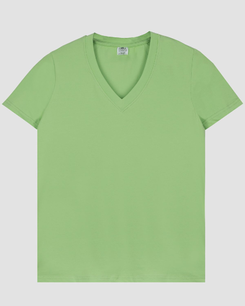 Футболка женская прямого силуэта с втачным коротким рукавом. Горловина V-образная, обработана воротником из основного полотна, в цвет изделия. Горловина спинки внутри обработана бейкой из кулирки. По горловине полочки отделочная строчка. Низ изделия и рукавов обработан швом вподгибку. Модель рассчитана на рост 164-170.