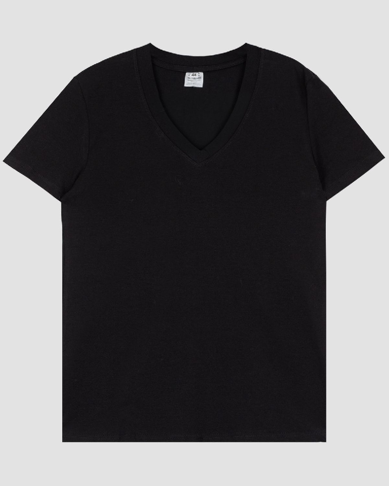 Футболка женская прямого силуэта с втачным коротким рукавом. Горловина V-образная, обработана воротником из основного полотна, в цвет изделия. Горловина спинки внутри обработана бейкой из кулирки. По горловине полочки отделочная строчка. Низ изделия и рукавов обработан швом вподгибку. Модель рассчитана на рост 164-170.