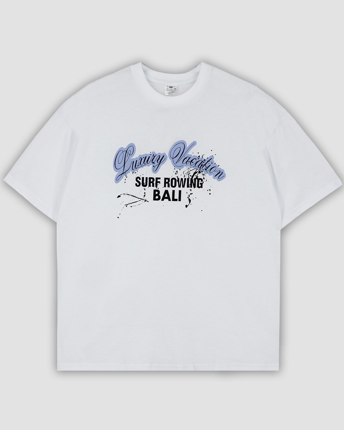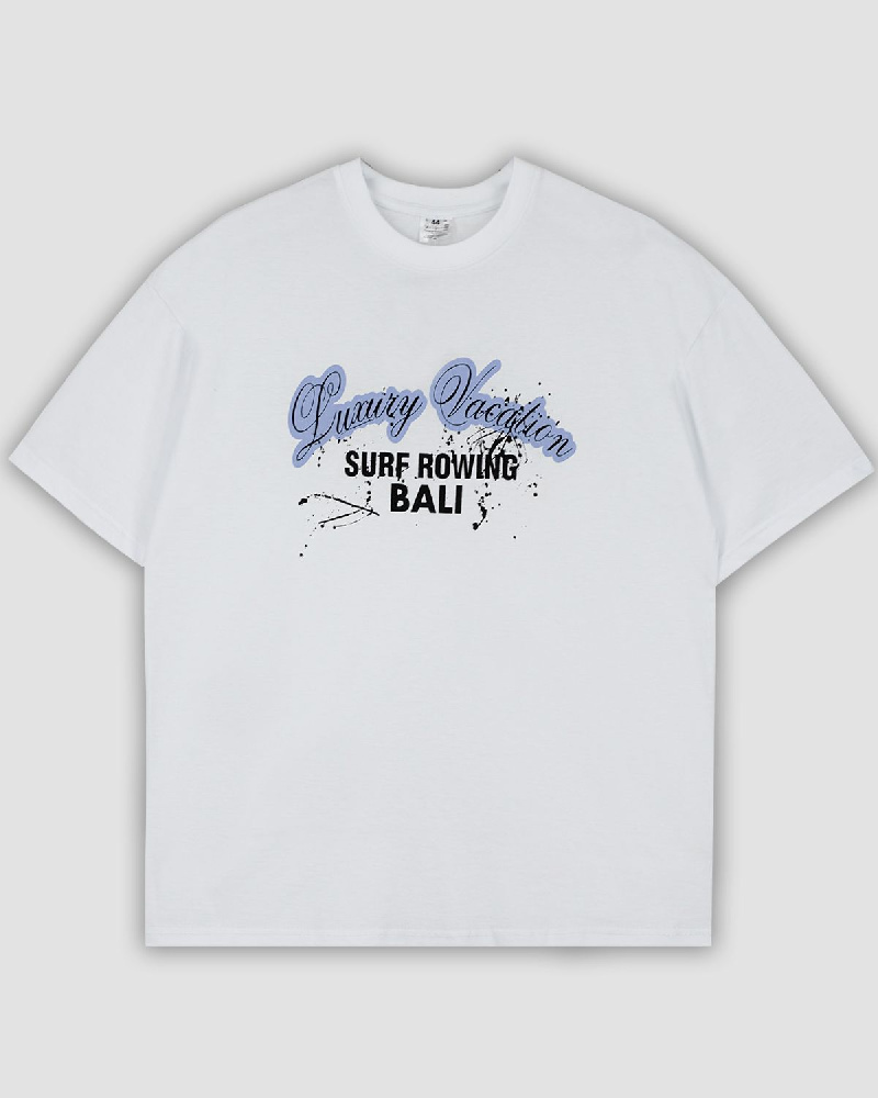 Футболка женская (оверсайз) свободного силуэта, с коротким рукавом. Горловина круглая, обработана воротником из рибаны. Горловина спинки внутри обработана бейкой из кулирки. Низ изделия и рукавов обработан швом вподгибку. На полочке принт ШЕЛКОГРАФИЯ. Надпись переводится как "Роскошный отдых;Серфинг на Бали". Модель рассчитана на рост 164-170.