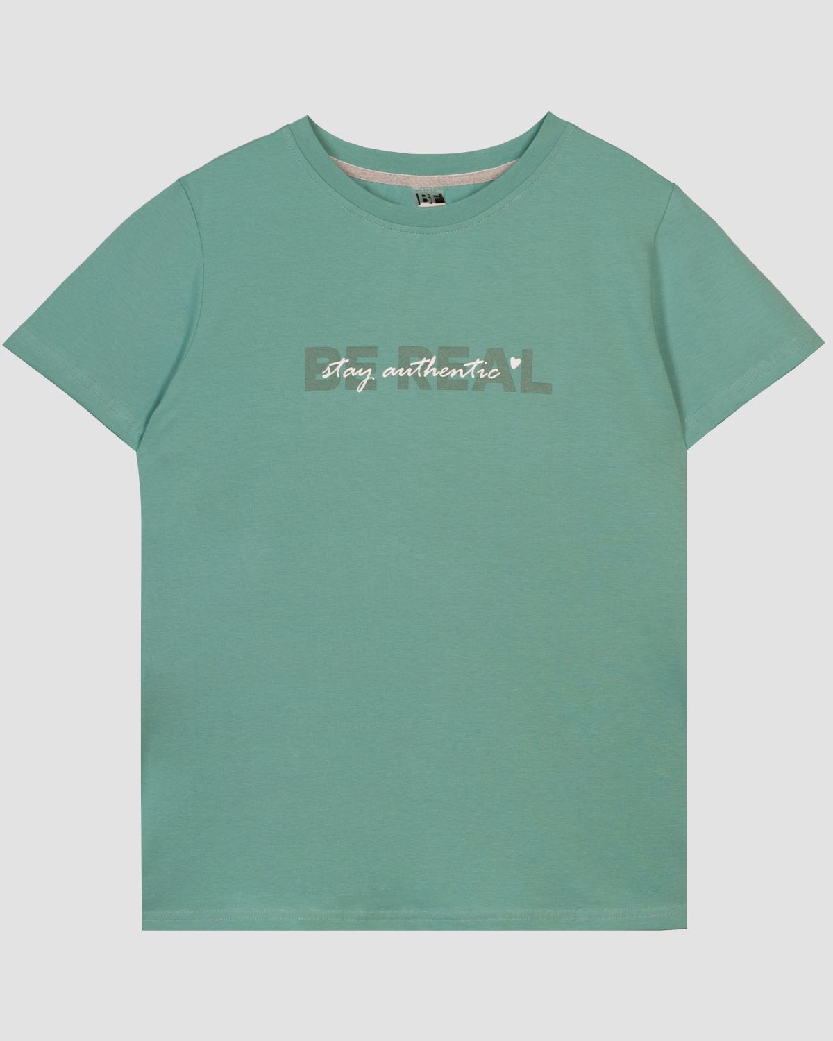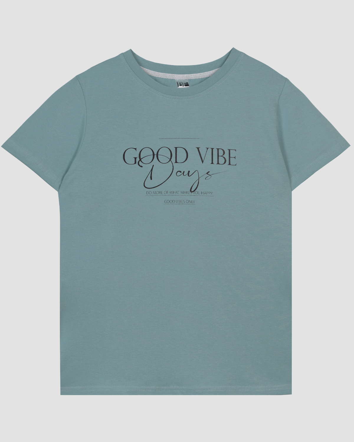 Футболка женская прямого силуэта с втачным коротким рукавом. Горловина круглая, обработана воротником из рибаны. Горловина спинки внутри обработана бейкой из кулирки. По горловине полочки отделочная строчка. Низ изделия и рукавов обработан швом вподгибку. На полочке принт шелкография. Модель рассчитана на рост 164-170см.
