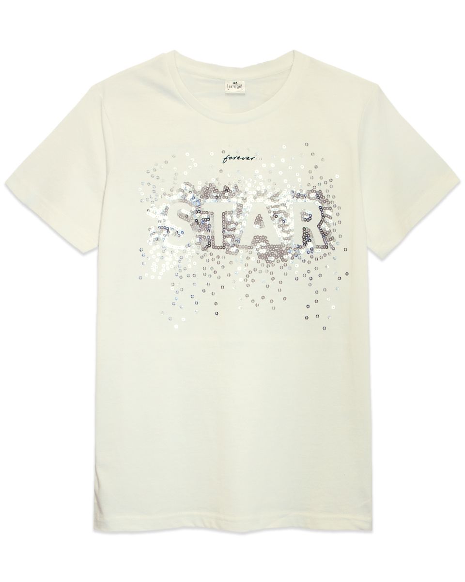 Футболка женская прямого силуэта с втачным коротким рукавом. Горловина круглая, обработана воротником из кулирки. Горловина спинки внутри обработана настрочной планкой из кулирки. Низ изделия и рукавов обработан швом вподгибку. На полочке принт шелкография с глиттером + вышивка пайетками. Модель рассчитана на рост 164-170см.