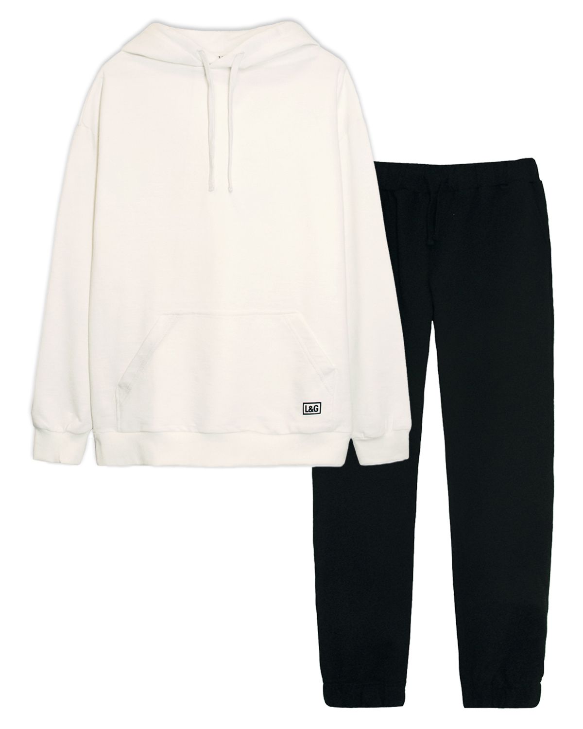 Комплет женский. Брюки женские прямого силуэта. Пояс отрезной, выполнен из основного полотна, с эластичной тесьмой внутри, шириной 5 см, тесьма закреплена в шов. По поясу брюк вставлен плоский утягивающий шнурок в цвет брюк, низ шнурка подвернут и застрочен, шнурок закреплен отстрочкой вдоль пояса. На изделии выполнены карманы с отрезным бочком и отлетной мешковиной, вход в карман обтачной. По низу изделия манжеты из основного полотна с эластичной тесьмой внутри в цвет изделия. Модель рассчитана на рост 164-170. Толстовка взрослая прямого силуэта с спущенным длинным рукавом. Горловина круглая с капюшоном. Капюшон состоит из 2 половин. Горловина спинки внутри обработана настрочной планкой из киперной ленты. С изнанки капюшона выполнен подклад из кулирки. По переднему срезу капюшона для утяжки вставлен утягивающий круглый канатный шнурок в цвет изделия, по низу шнурка узелок. Для выхода шнурка предусмотрены пробивные петли. Рукав заканчивается манжетой из основного полотна. По низу изделия пояс из основного пол